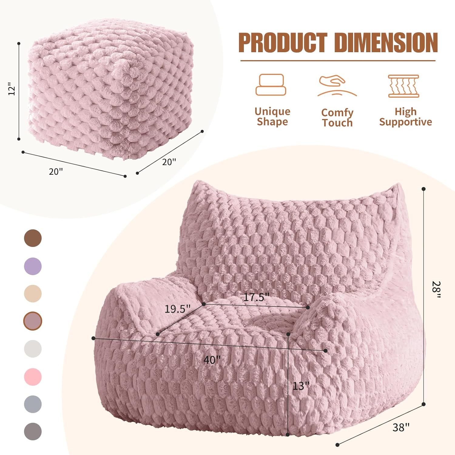 - Ergonomic Design: The adult bean bag chair is ergonomically designed to provide excellent support for your body and posture. This oversized beanbag chair with filler features a perfect backrest and armrests design, accommodating any body type and ensuring optimal comfort for relaxation. The comfy bean bag seat measures 40"x38"x28", with an ottoman of 20"x12", please check sizes before purchase.