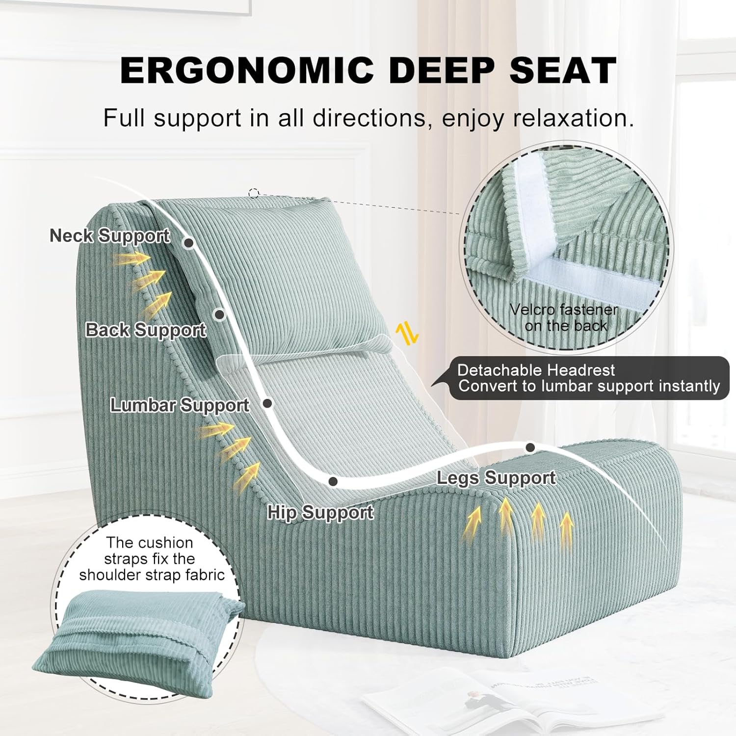 Giant Bean Bag Chair for Adults,Corduroy Chaise Lounge with Unrivaled Back Support, Detachable Neck Pillow, Comfortable Ottoman & Washable Cover for Living Room, Bedroom, Garden(Mint Green)