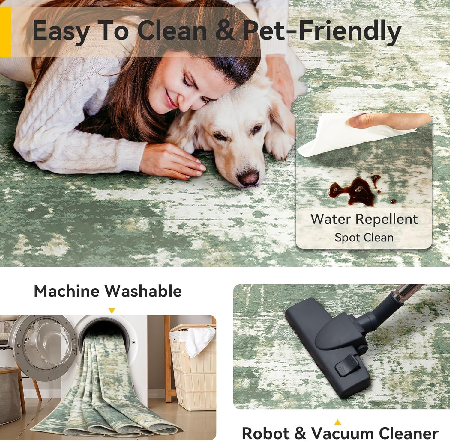 Washable Area Rugs 8'x10' Non-Slip Modern Abstract Soft for Living Room Entryway Bedroom Nursery, Print Pattern, Light Green/Yellow