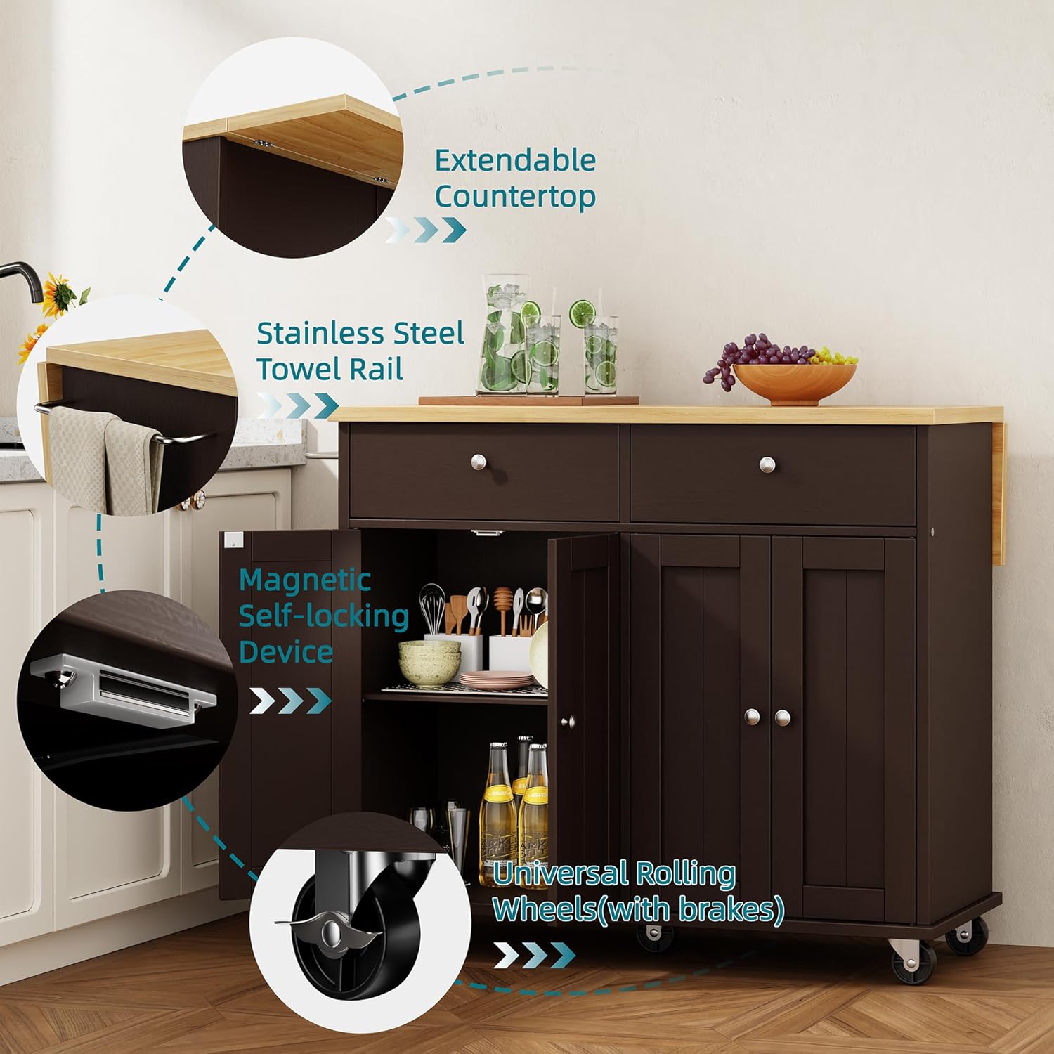 - Universal Rolling Wheels: Smooth-rolling wheels allow easy relocation to any room, while locking mechanisms secure the island in place. Keep essentials handy wherever you work, whether in the kitchen, dining area, or entertaining space.