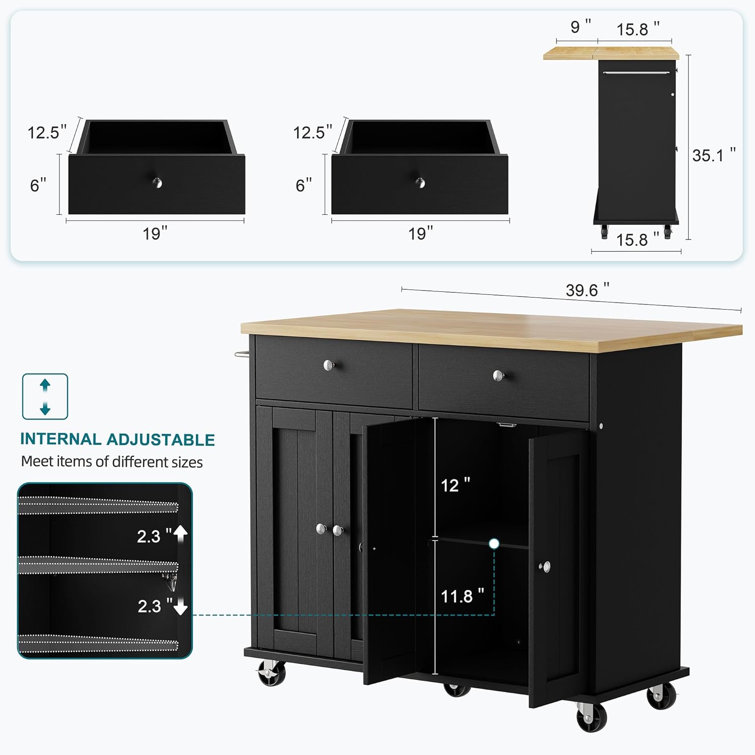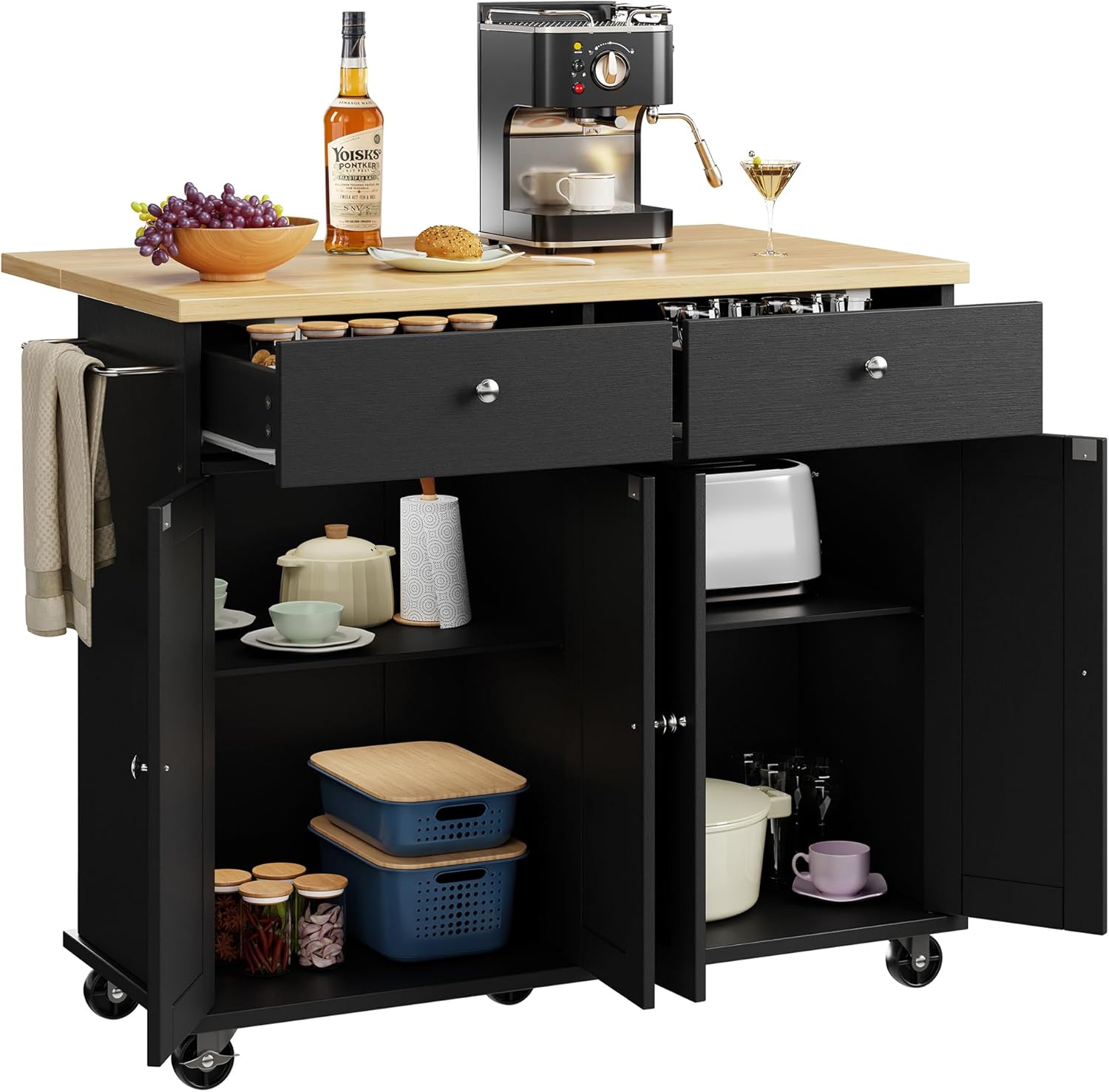 Shintenchi Kitchen Island with Drop Leaf, Rolling Kitchen Cart with Storage on Wheels, Table Bar Cart for Kitchen with Towel Rack & Seating Area for Dining Room, Black