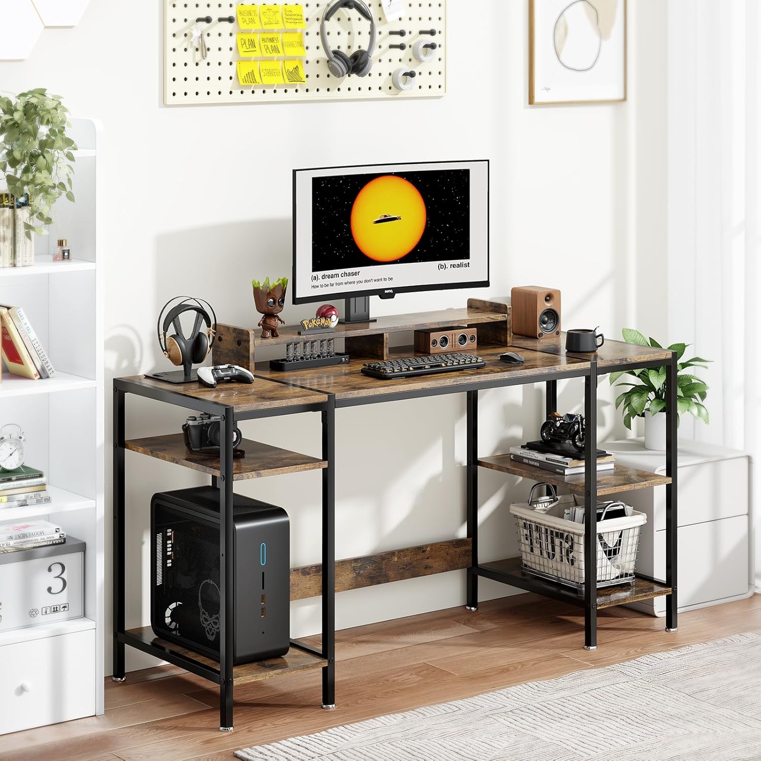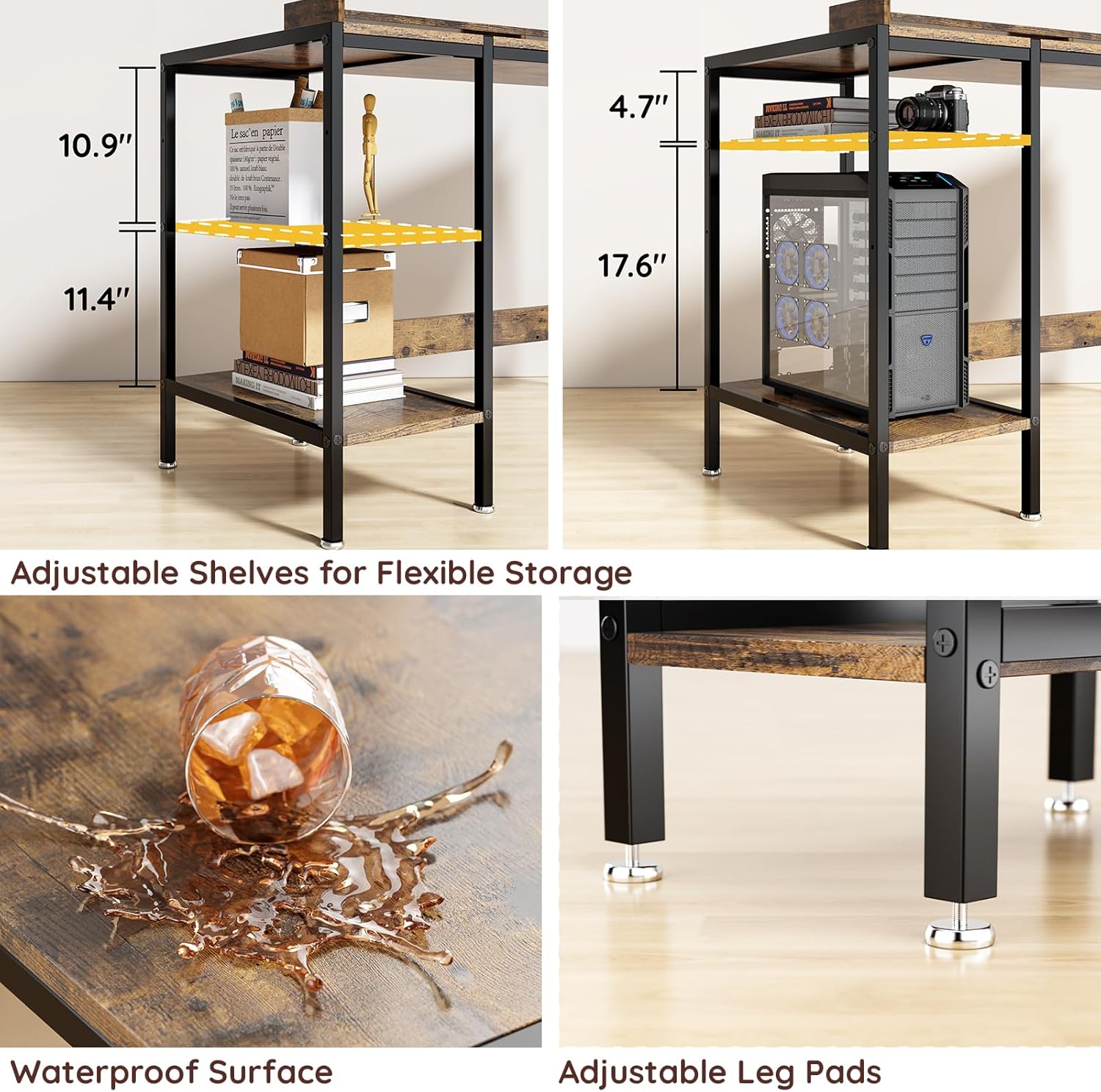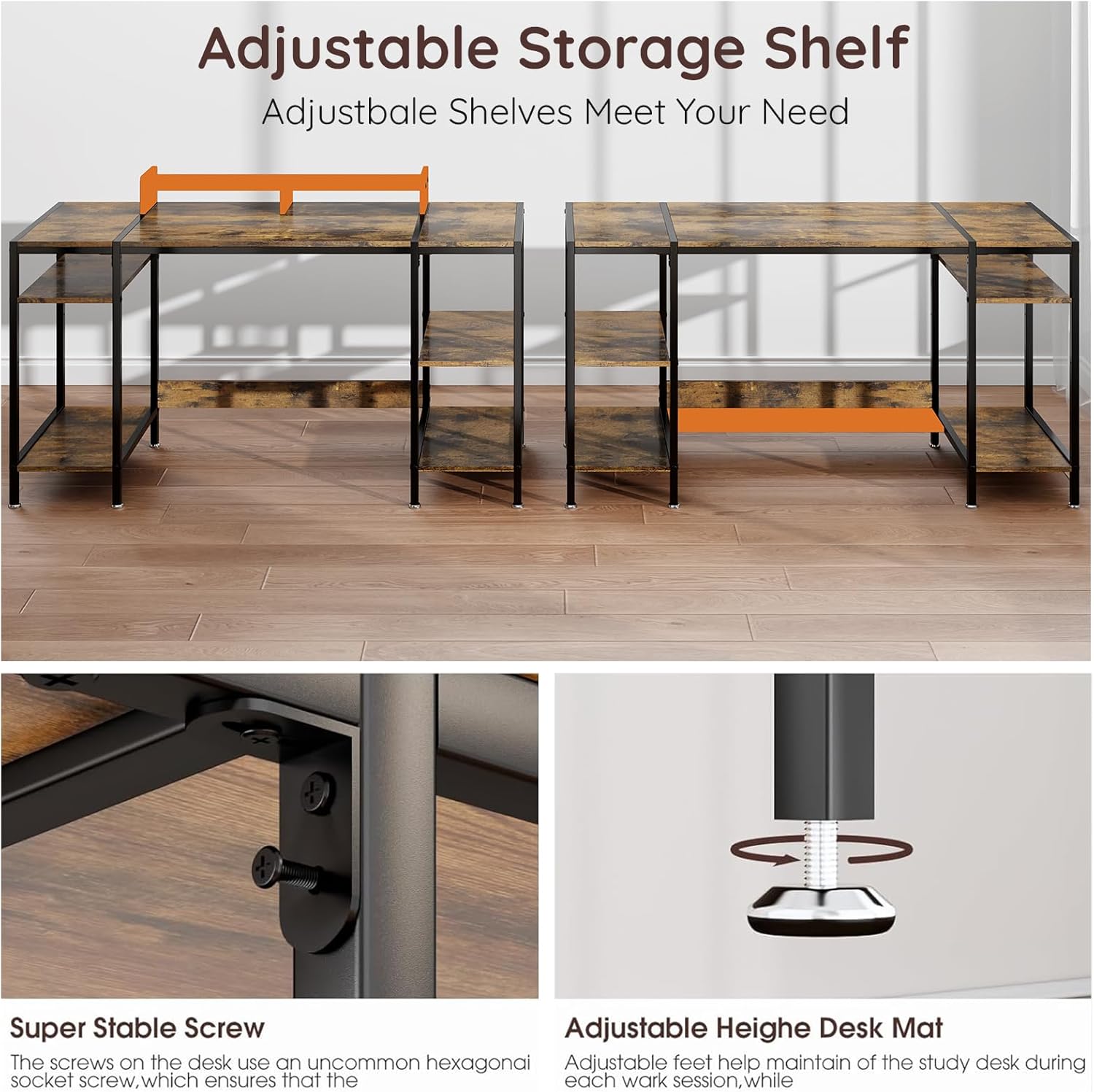 - 【Adjustable Storage Space】The open storage rack of the computer desk has an adjustable internal height, greatly increasing storage space and making it perfect for storing your office, study, gaming and other supplies. Not only does it have a large storage space, but it can also change styles. This modern office desk equipped with a monitor stand, storage function, practical, sturdy, and affordable is exactly what you need
