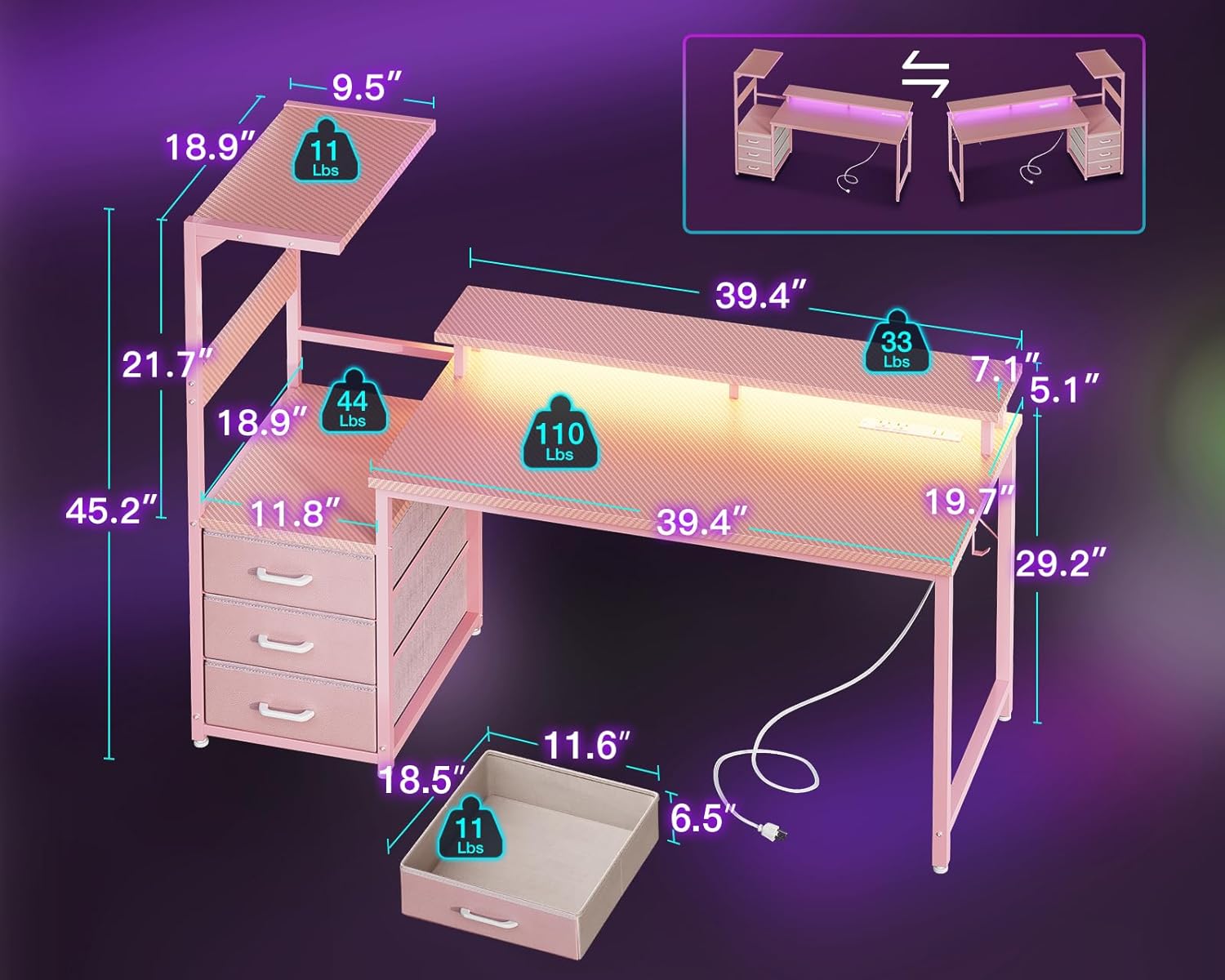 AODK 52 Inch Gaming Desk with USB Charging Ports & LED Light- Reversible Computer Desk with Storage Shelves & Monitor Stand, Modern Gamer Desk Table with Fabric Drawers & Side Hook, Carbon Fiber Pink