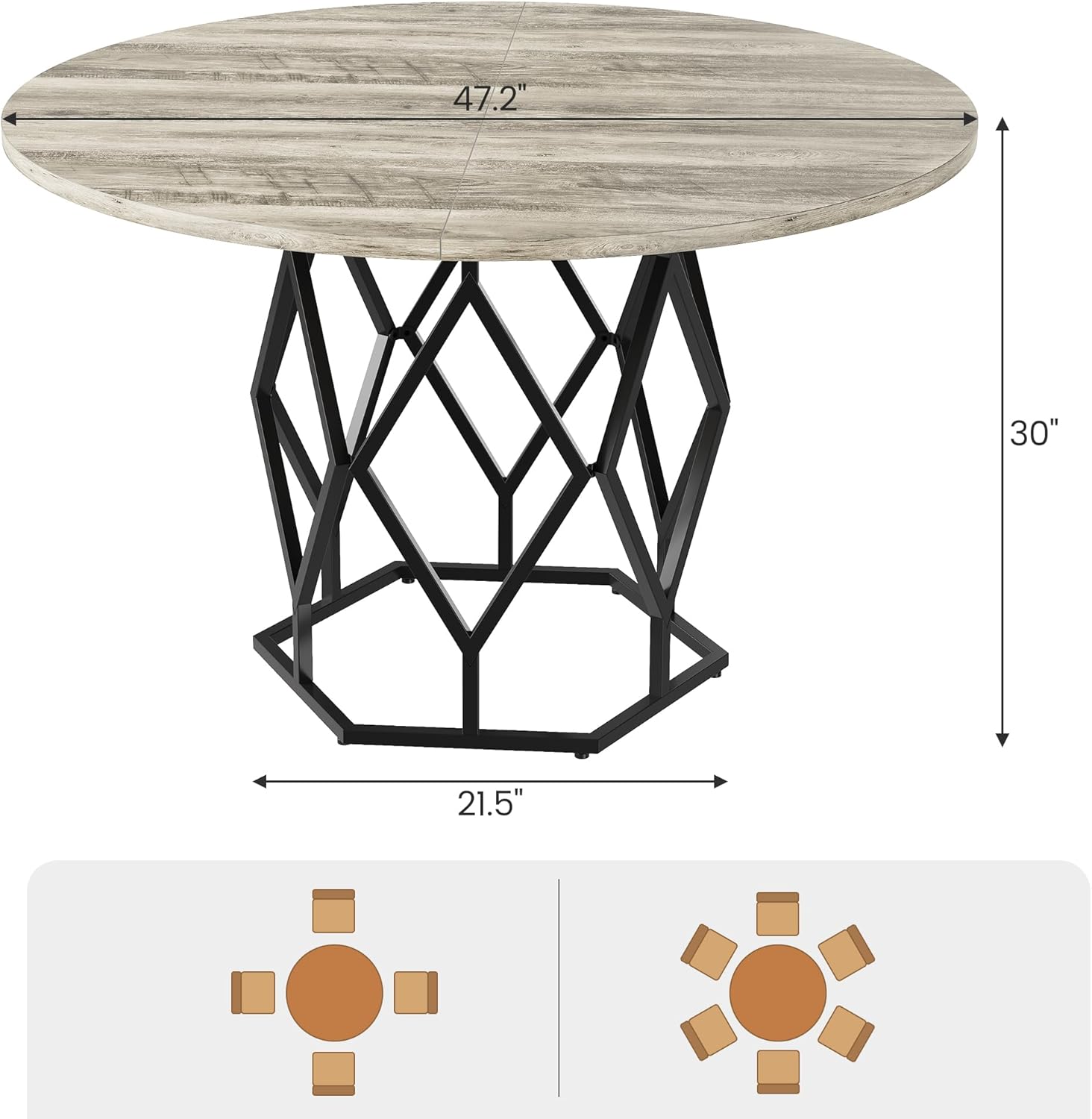 GarveeHome Round Dining Table for 4-6 People, 47 Inch Farmhouse Kitchen Table, Sturdy Metal Base, Industrial Wood Dinning Room Table for Kitchen, Grey