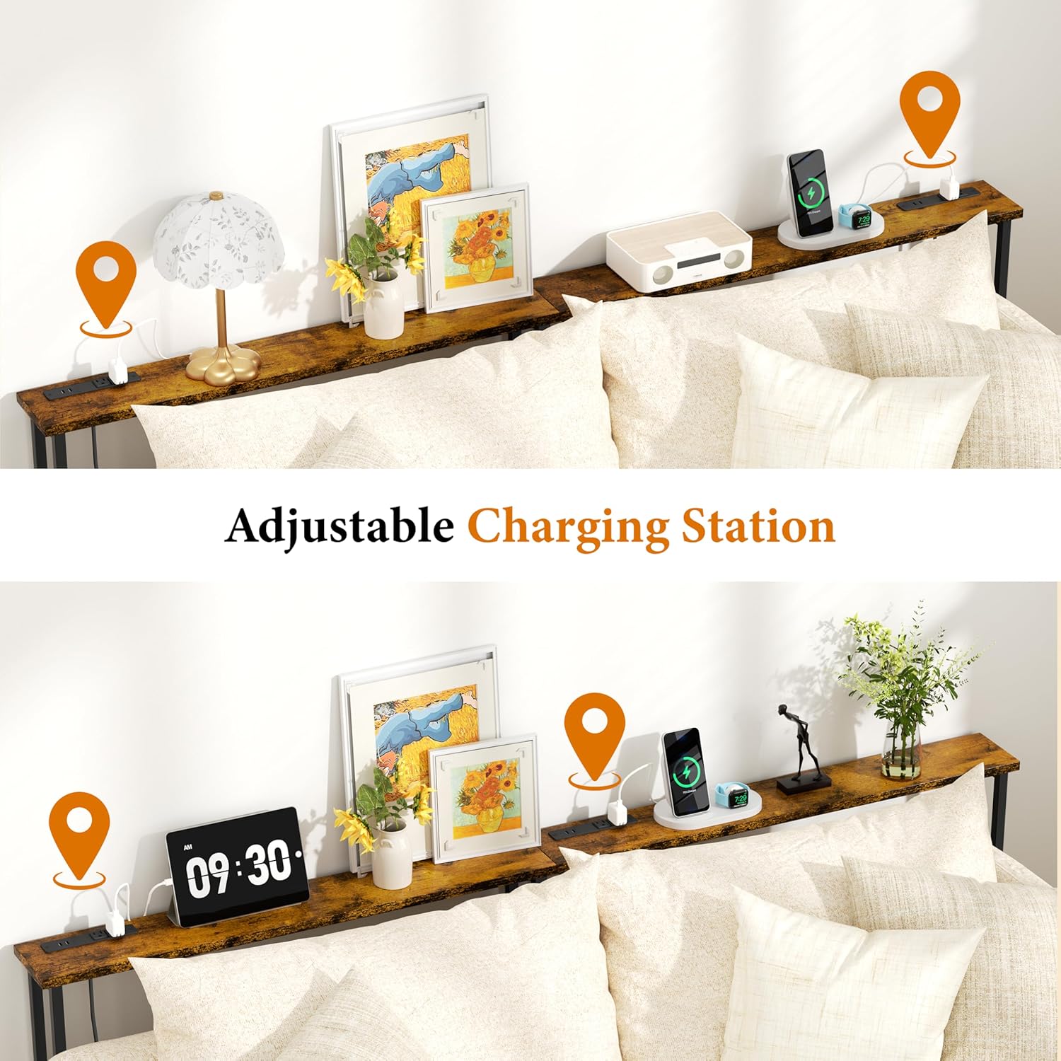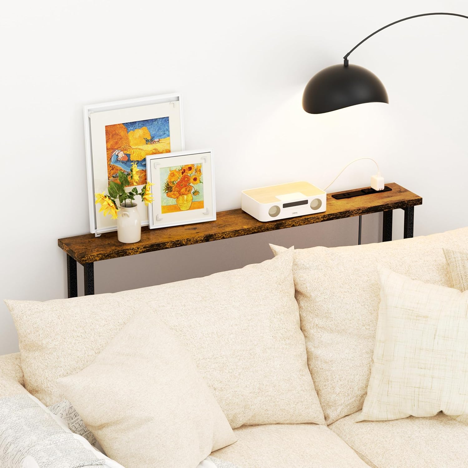 - 【Smart Charging Behind Your Sofa】Designed to fit behind your couch, this 90" extra-long sofa table features two built-in power outlets, each with 2 AC outlets & 2 USB ports (total: 4 AC + 4 USB), plus a 4.9ft power cord. Conveniently charge your laptops, phones, lamps, and more—all within arm’s reach.