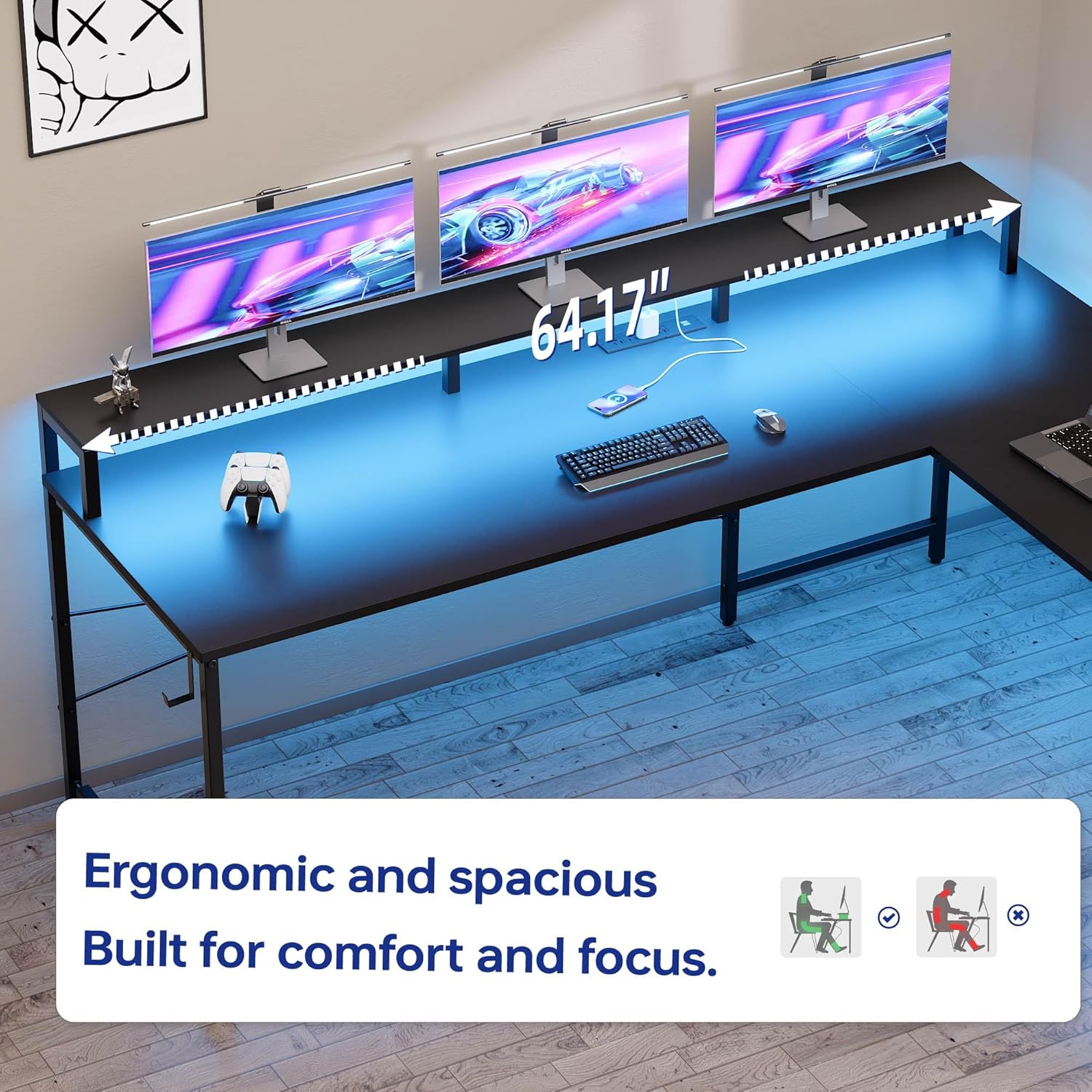 - Ample desktop Space: The Corner Computer Desk offers a spacious 64 inch x 20 inch (12.36 sq ft) work surface, come with a monitor stand that accommodates up to three monitors for improved visibility and ergonomic comfort. The design also creates extra storage space underneath for books, keyboards, and accessories. This computer desk provides ample space for your laptop,monitor, keyboard, and other daily essentials, enhancing work efficiency and maintaining a tidy workspace.