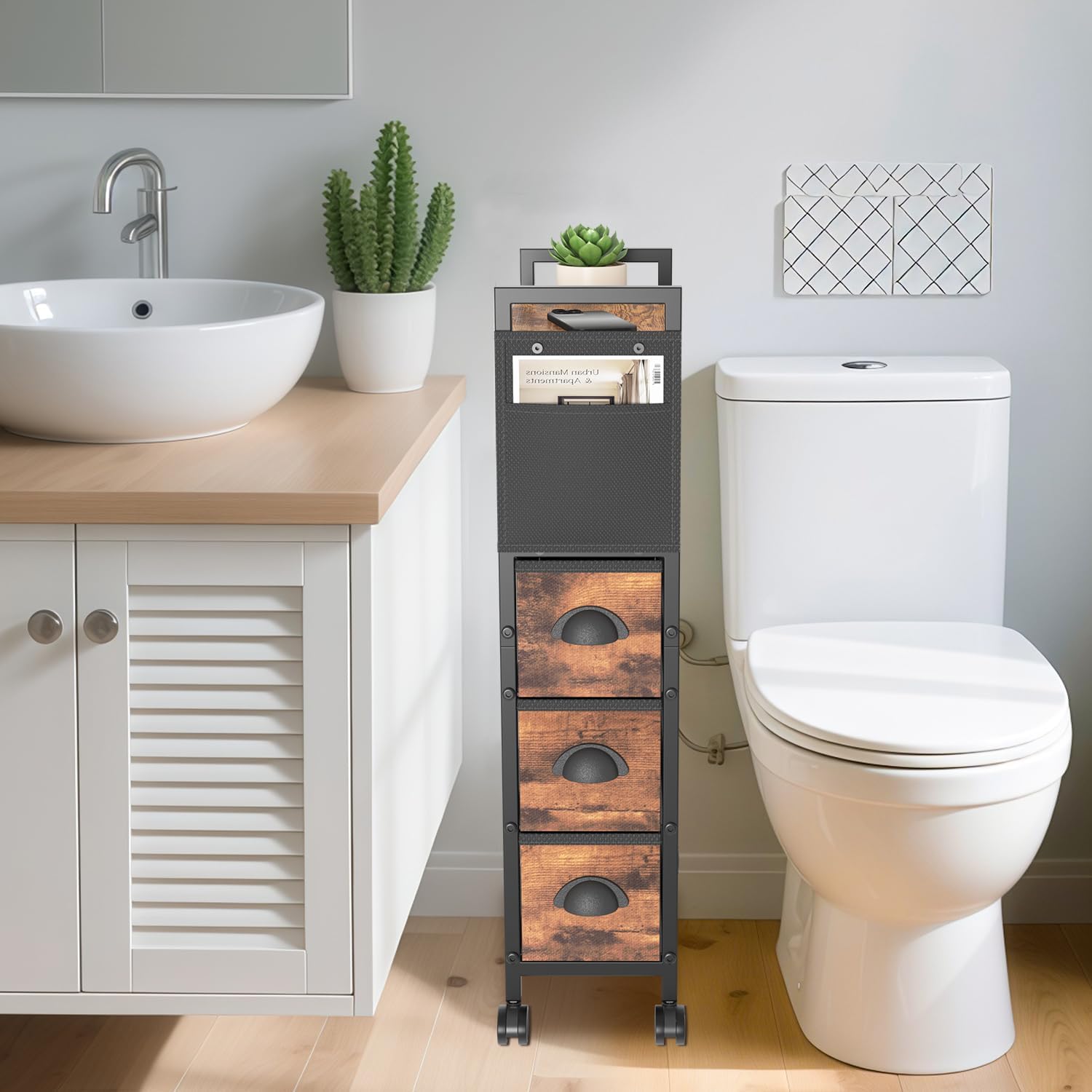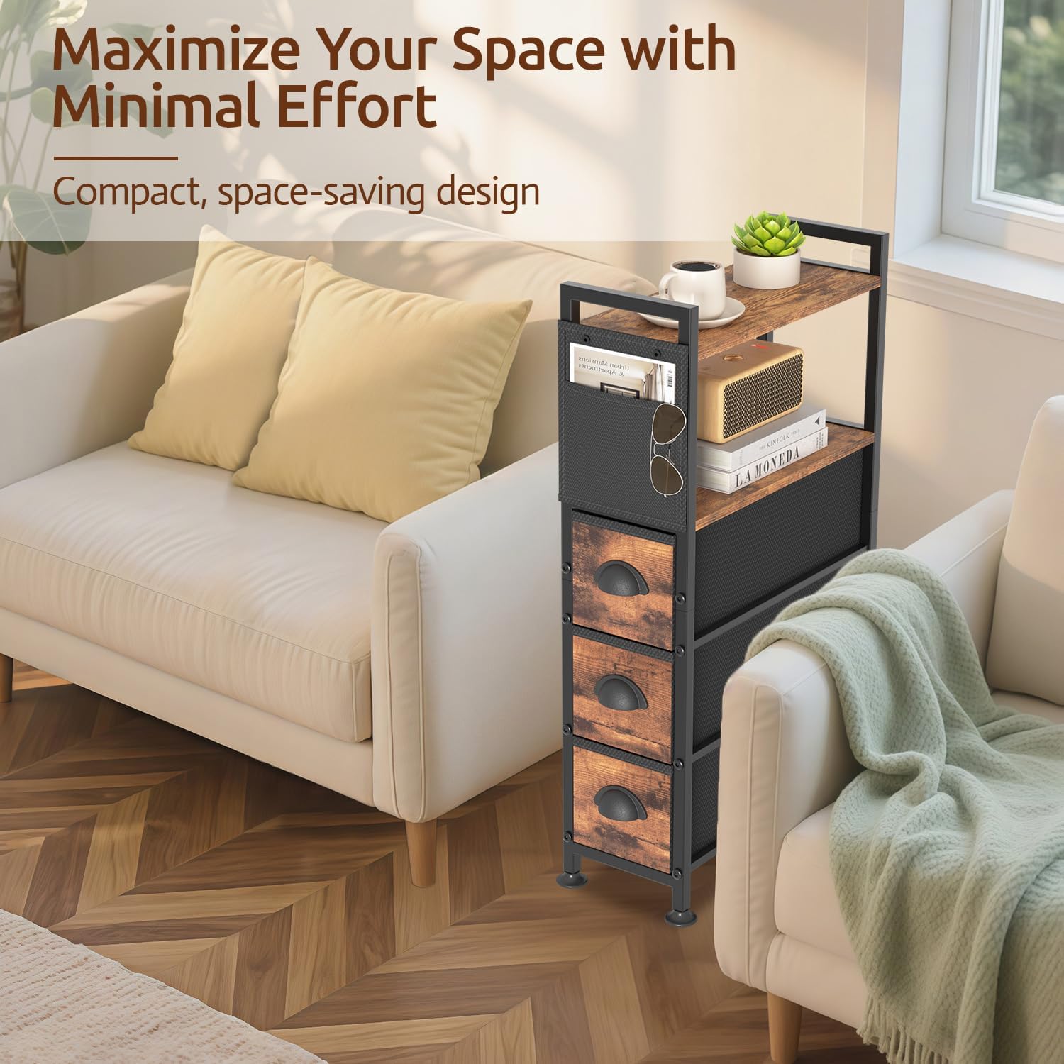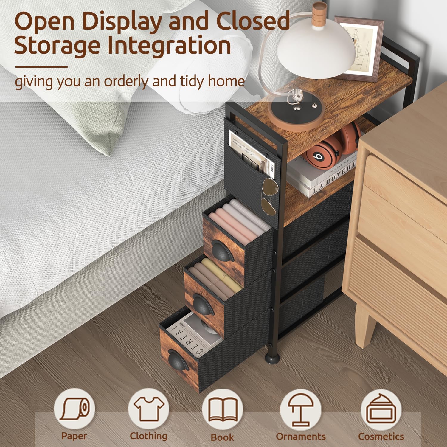 - [3 Deep Drawers:Dust-Free,Hassle-Free] Say goodbye to clutter and dust! Our 3 deep fabric drawers of Narrow night stand tall provide gap-free storage to keep your belongings clean and secure. Designed for durability and dirt-resistant. perfect for storing clothes, toys, or office supplies—your space stays tidy with zero effort.
