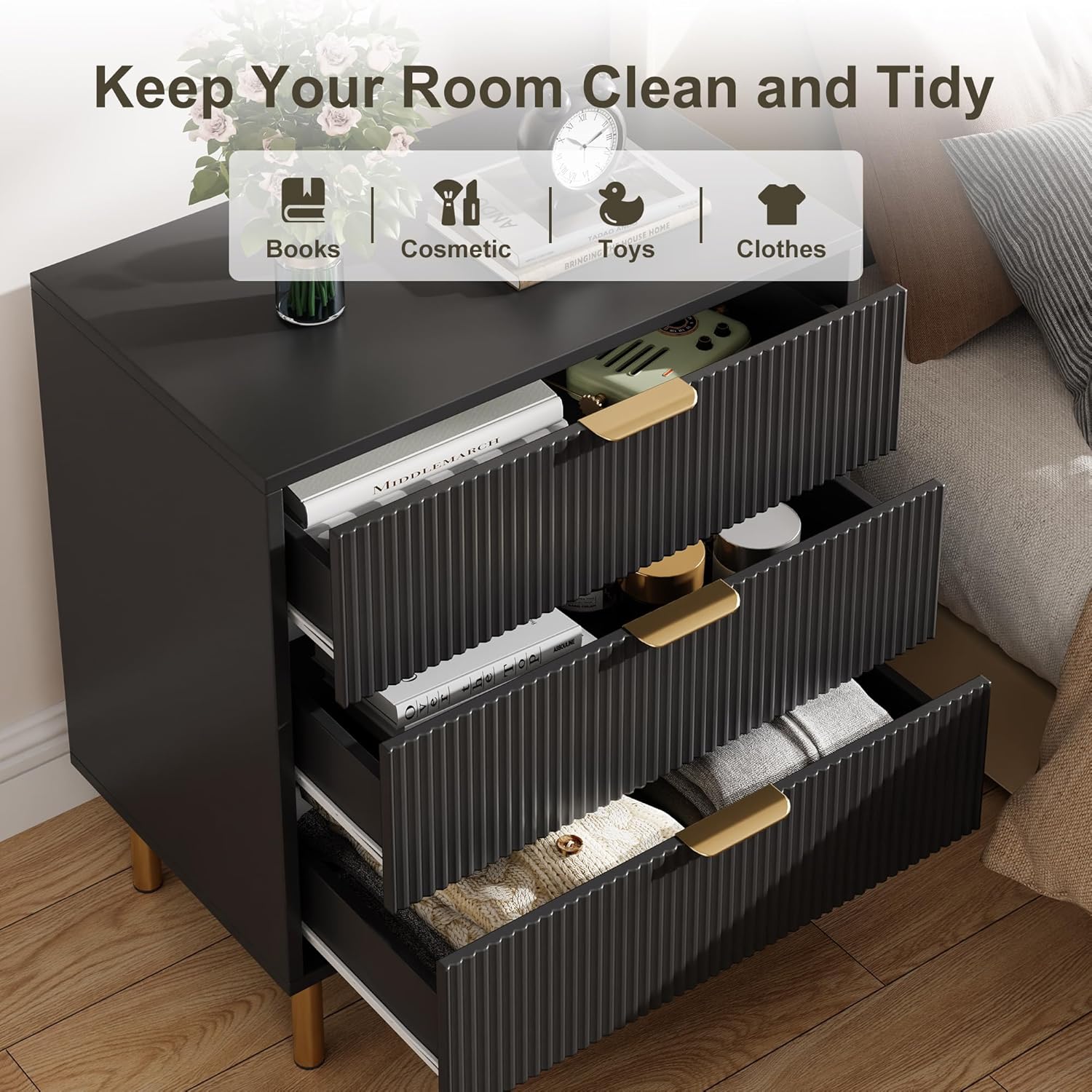 - Elegant & Stylish - GarveeHome Black dresser combines the unique groove design with the golden base and handle, it exudes an elegant atmosphere and will be the best decoration for your bedroom, easily matching any style to add a unique charm to your space.