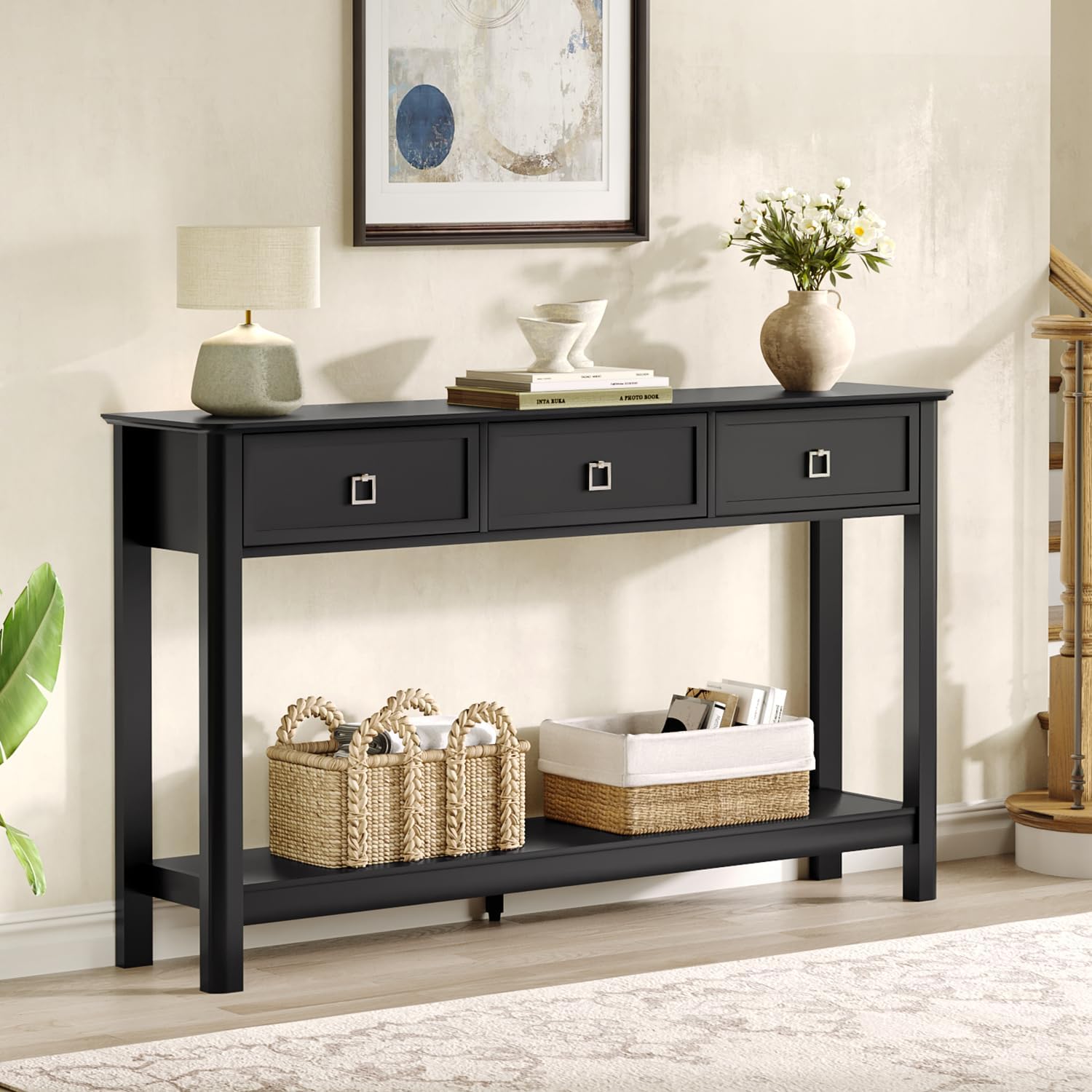 Treocho 53.1" Console Table with 3 Drawers, Modern Entryway Table, 2-Tier Narrow Long Sofa Table Behind Couch Table for Living Room, Hallway, Black