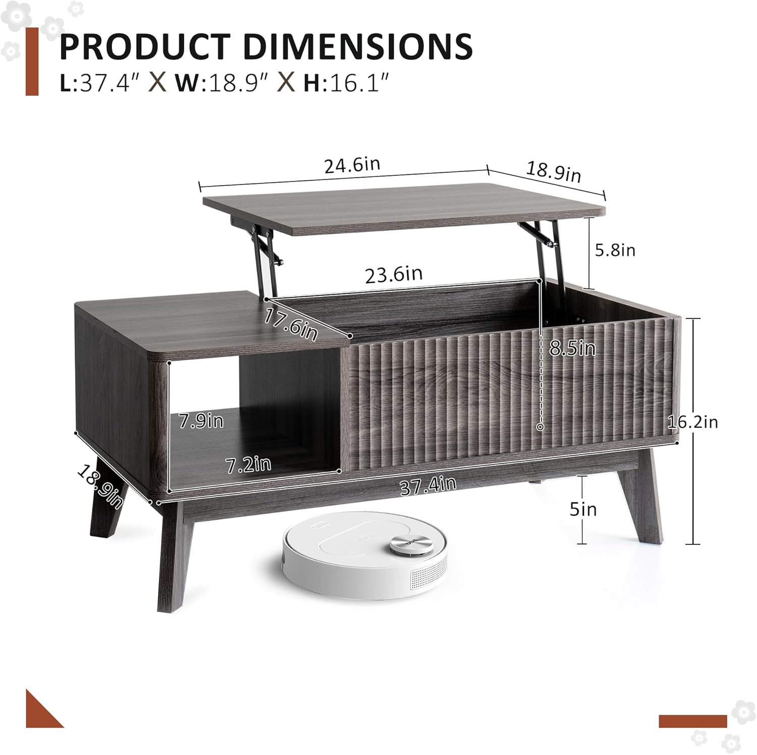 - Lift Top Design: The wooden coffee table is equipped with an upgraded hydraulic gas strut lift top system, it ensures smoother, balanced motion, preventing slamming.It can be lifted to a height of 23.6 inches from the ground to create a comfortable workspace or dining surface while you’re sitting on the sofa.
