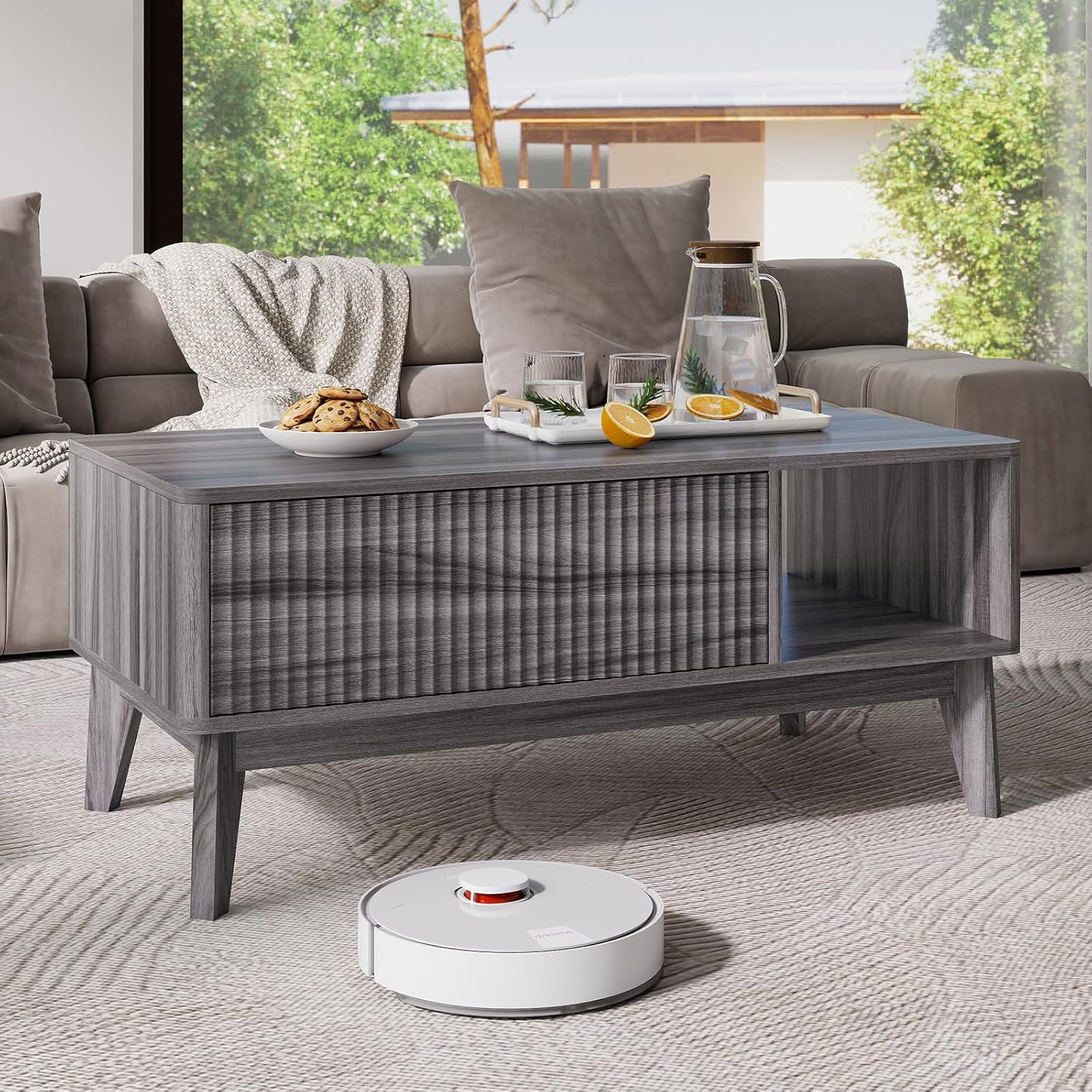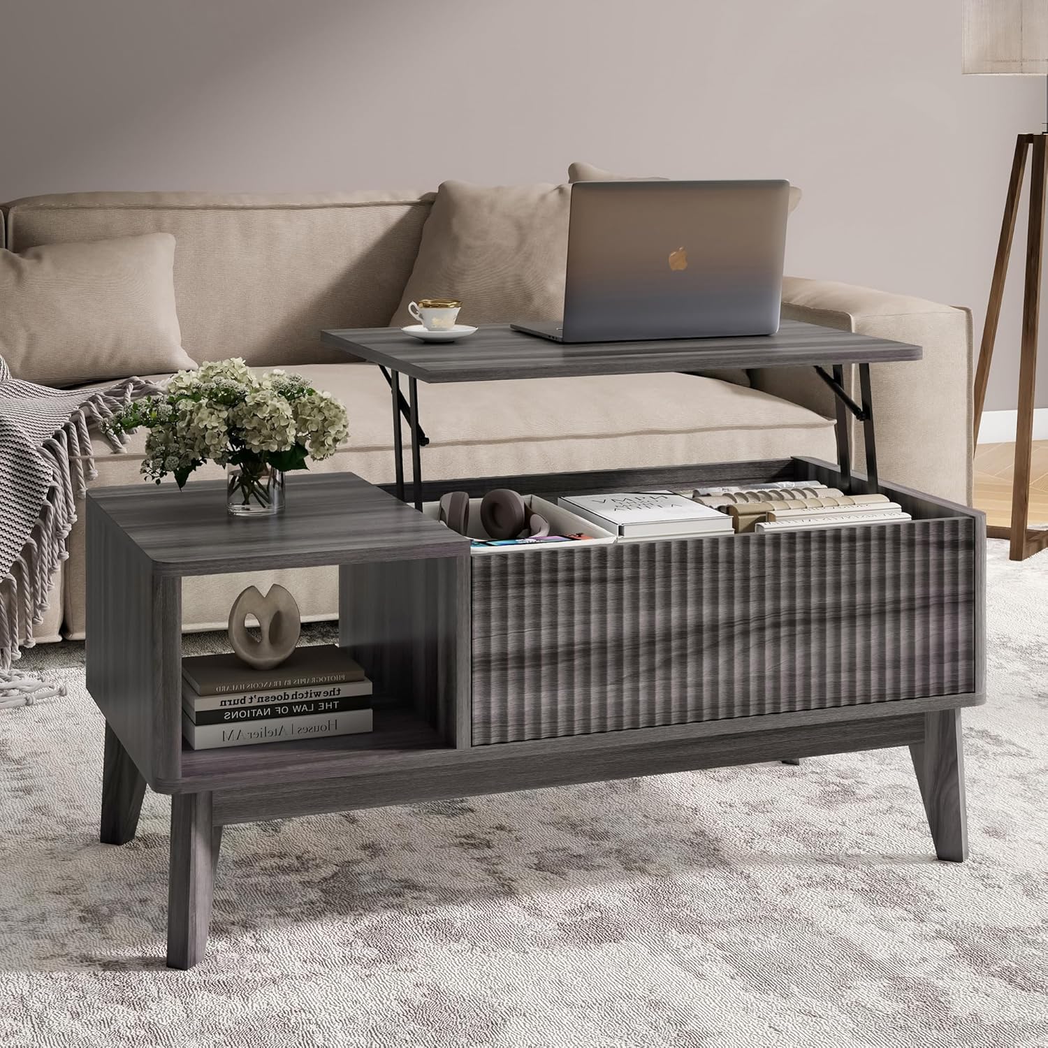 LYNCOHOME Fluted Lift Top Coffee Table with Storage,Modern Center Table for Living Room, Home Office(Grey)