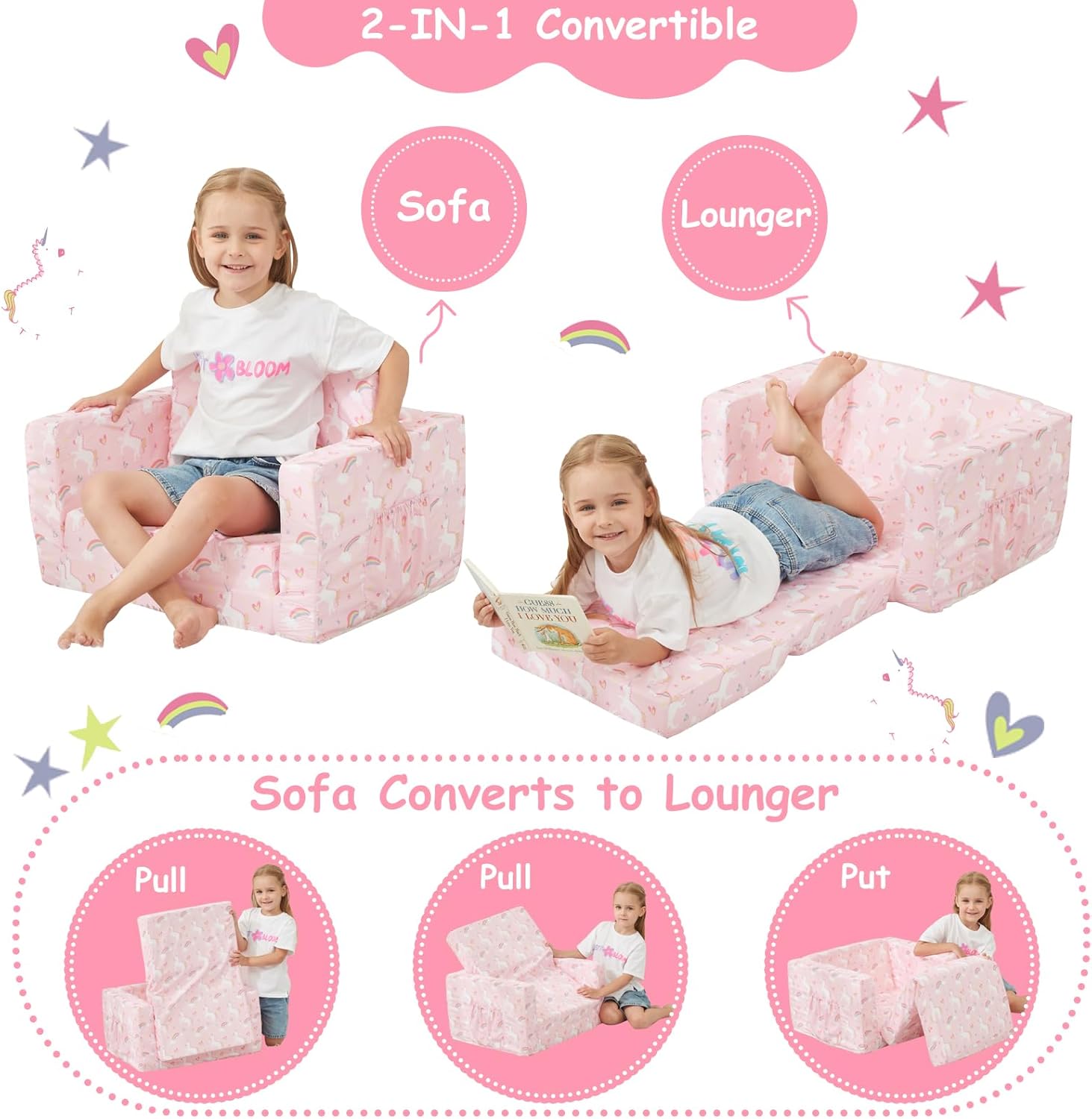 Viviland Kids Chairs for Toddler,2-in-1 Soft Toddler Couch Fold Out,Convertible Soft to Lounger Toddke Chair Comfy for Girls and Boys,Pink Unicorn