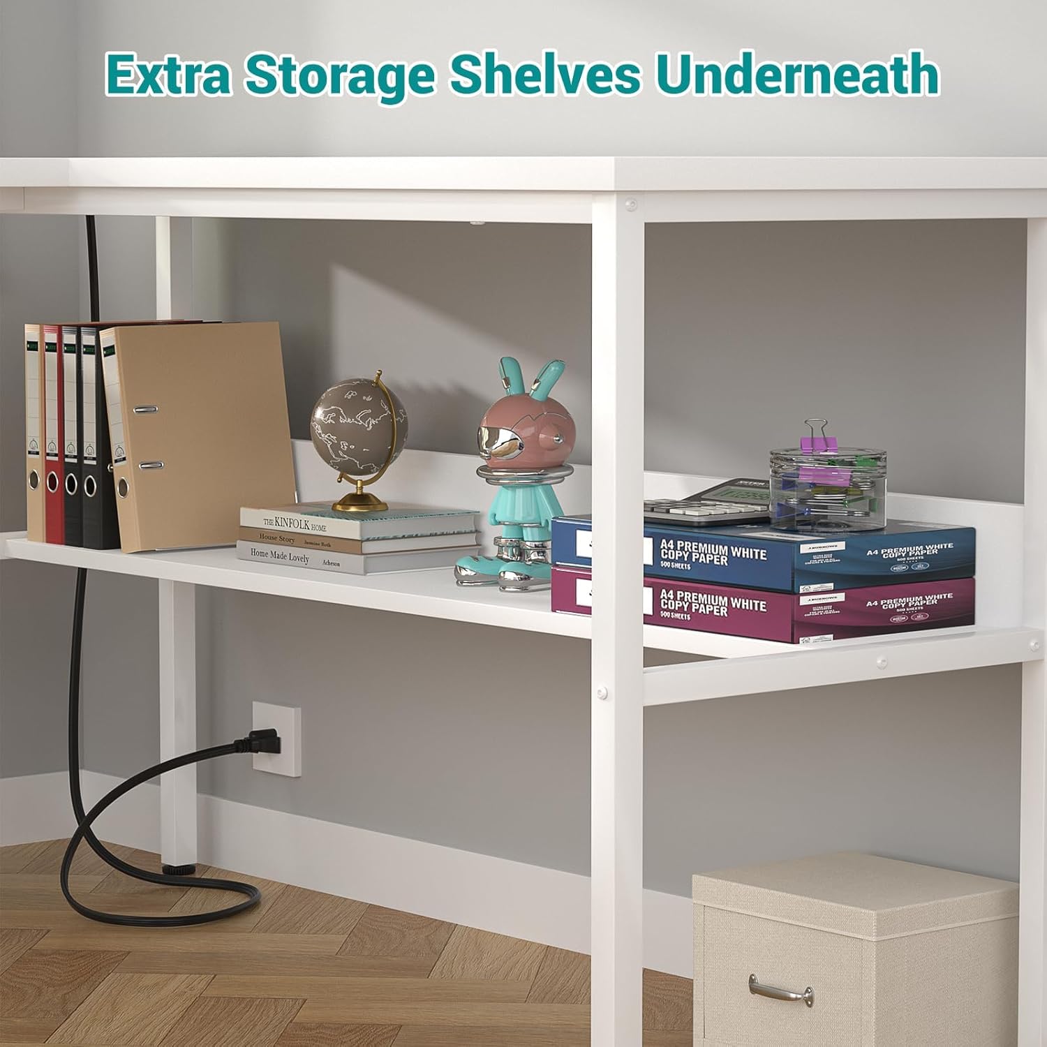 Reversible L Shaped Gaming Desk with Power Outlets and USB Charging Ports, Sturdy Computer Desks with Storage Shelf, Modern Corner Desk Home Office Table, Easy to Assemble, White