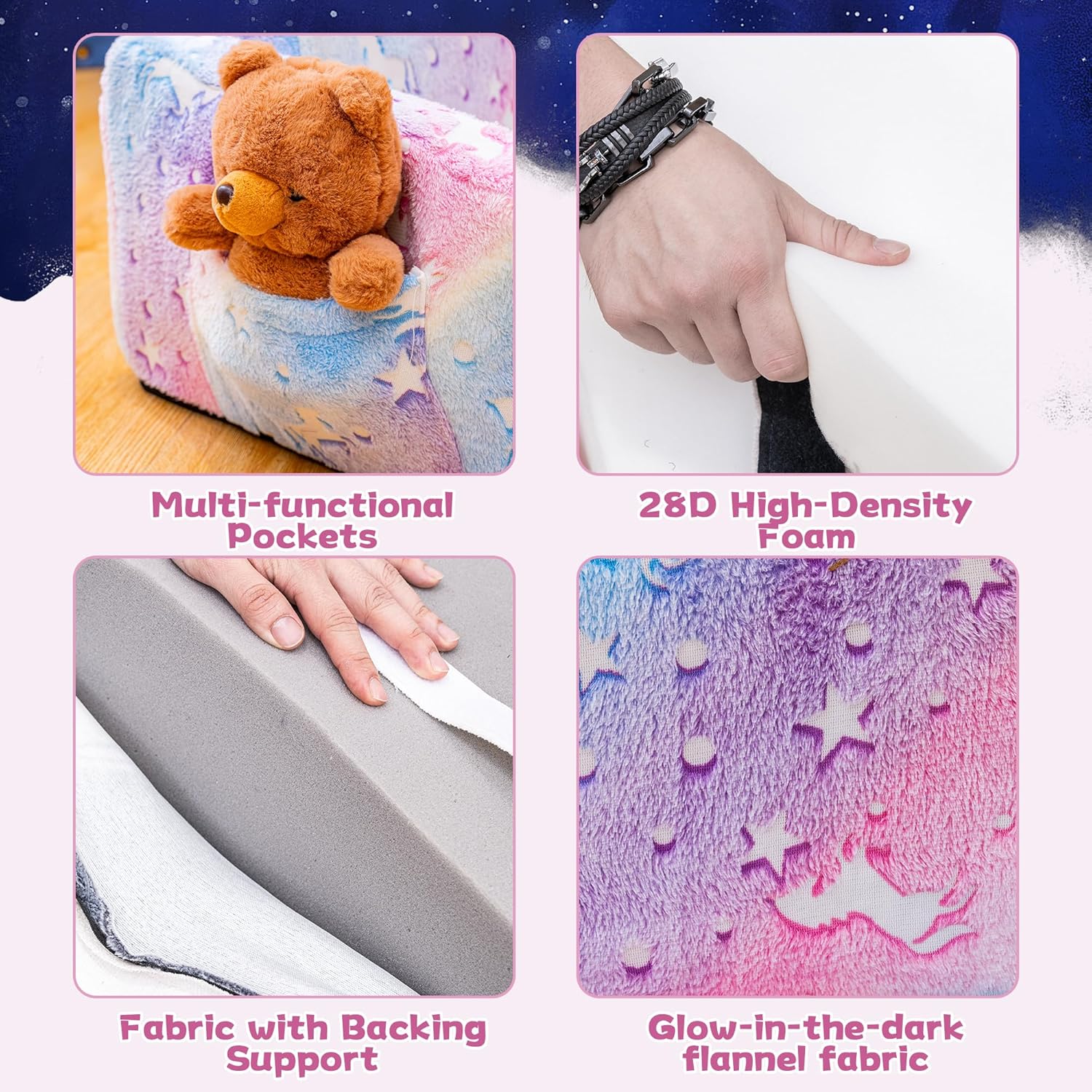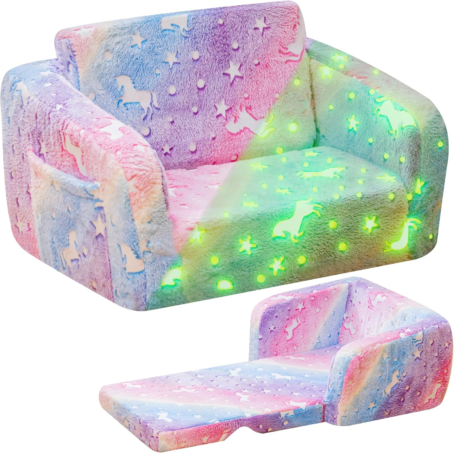 Lamerge 2-in-1 Soft Toddler Couch Fold Out,Foldable Toddler Chair, Glow in The Dark Kids Sofa for playroom,Convertible Foam and Floor Cushion for Boys and Girls (Rainbow and Unicorn)