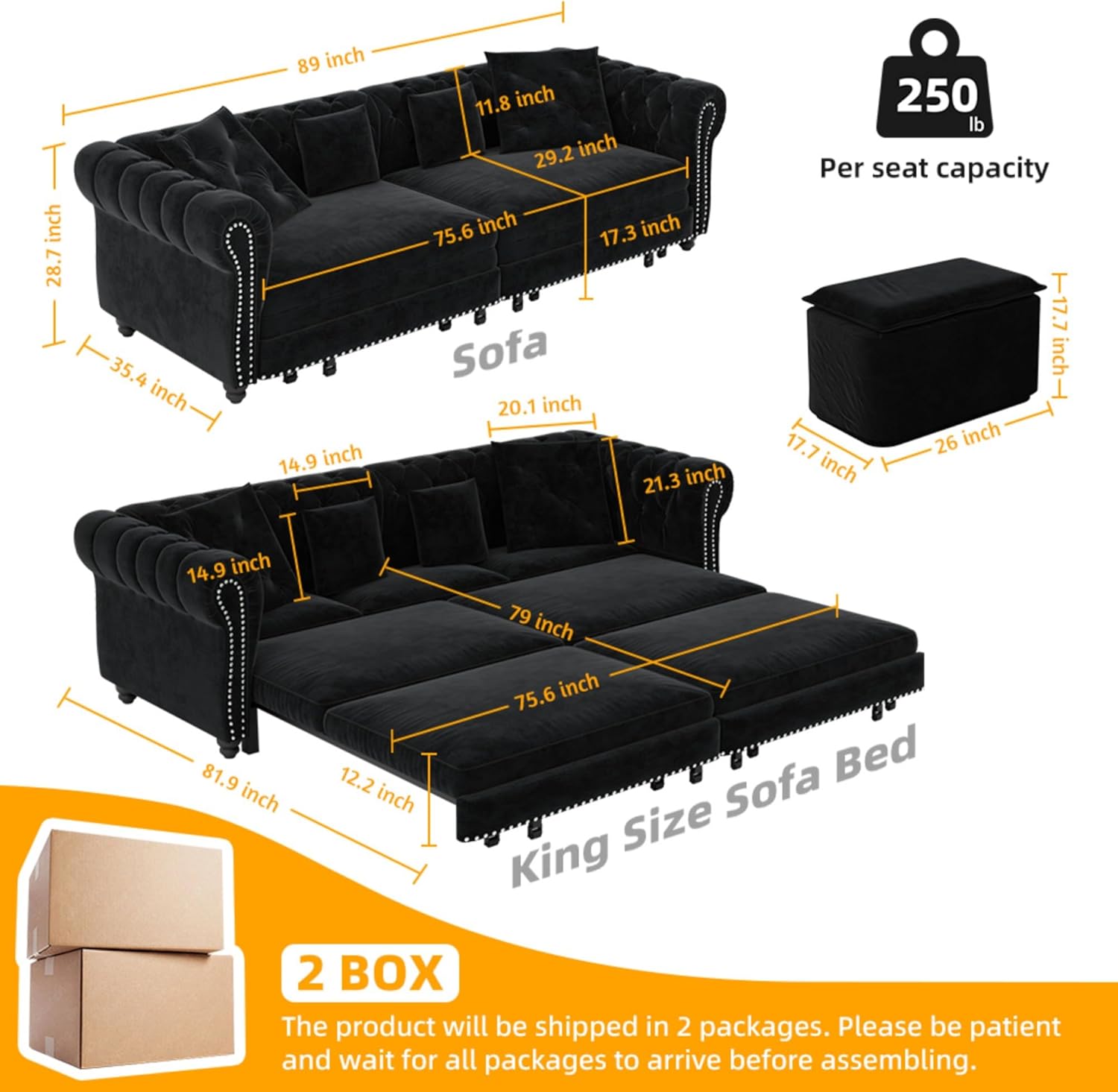 - [3-in-1 Convertible Sofa Bed] This 89" velvet Chesterfield sofa effortlessly transforms from a stylish 3-seater couch to a cozy King-size sleeper bed, providing ultimate versatility. Ideal for small spaces, it maximizes utility without compromising style.