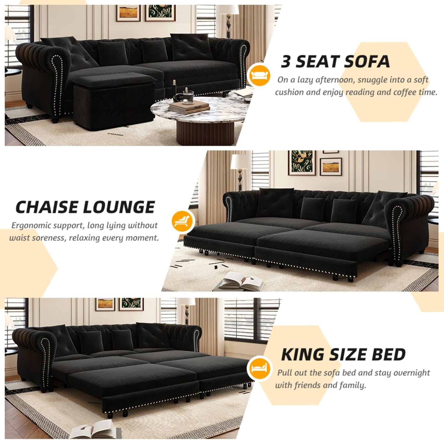 KEIKI 3-in-1 Velvet Chesterfield Sofa Bed with Ottoman, Convertible King Size Sleeper Couch, Rolled Arm Design, Comfortable 3-Seater for Living Room or Bedroom, Black