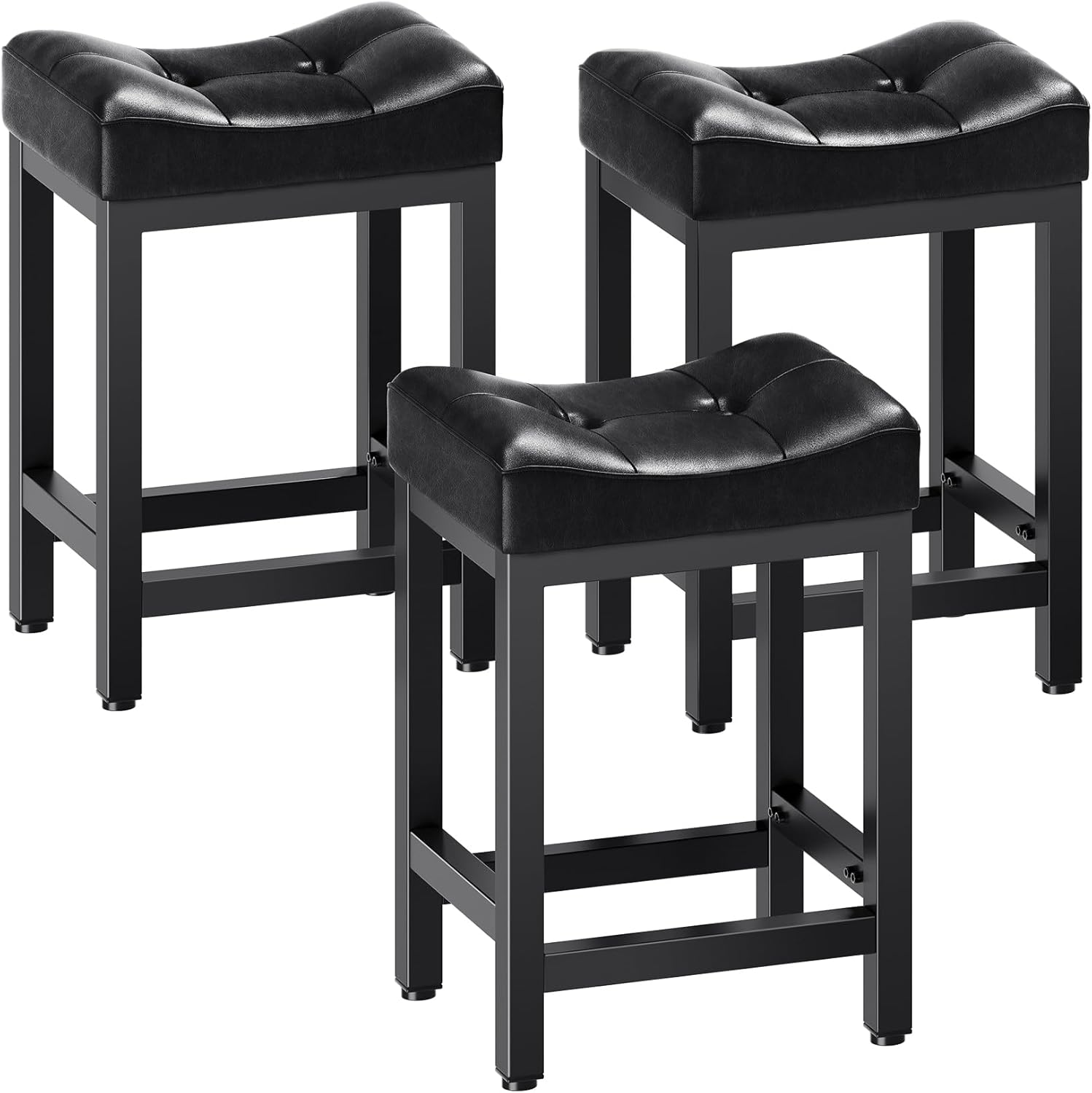 Dripex Backless Saddle Bar Stools Set of 3, Modern Faux Leather 24'' Counter Height Barstools with 4" Thick Seats & Heavy Duty Metal Legs, for Kitchen Island, Bar, Dining Room, Black