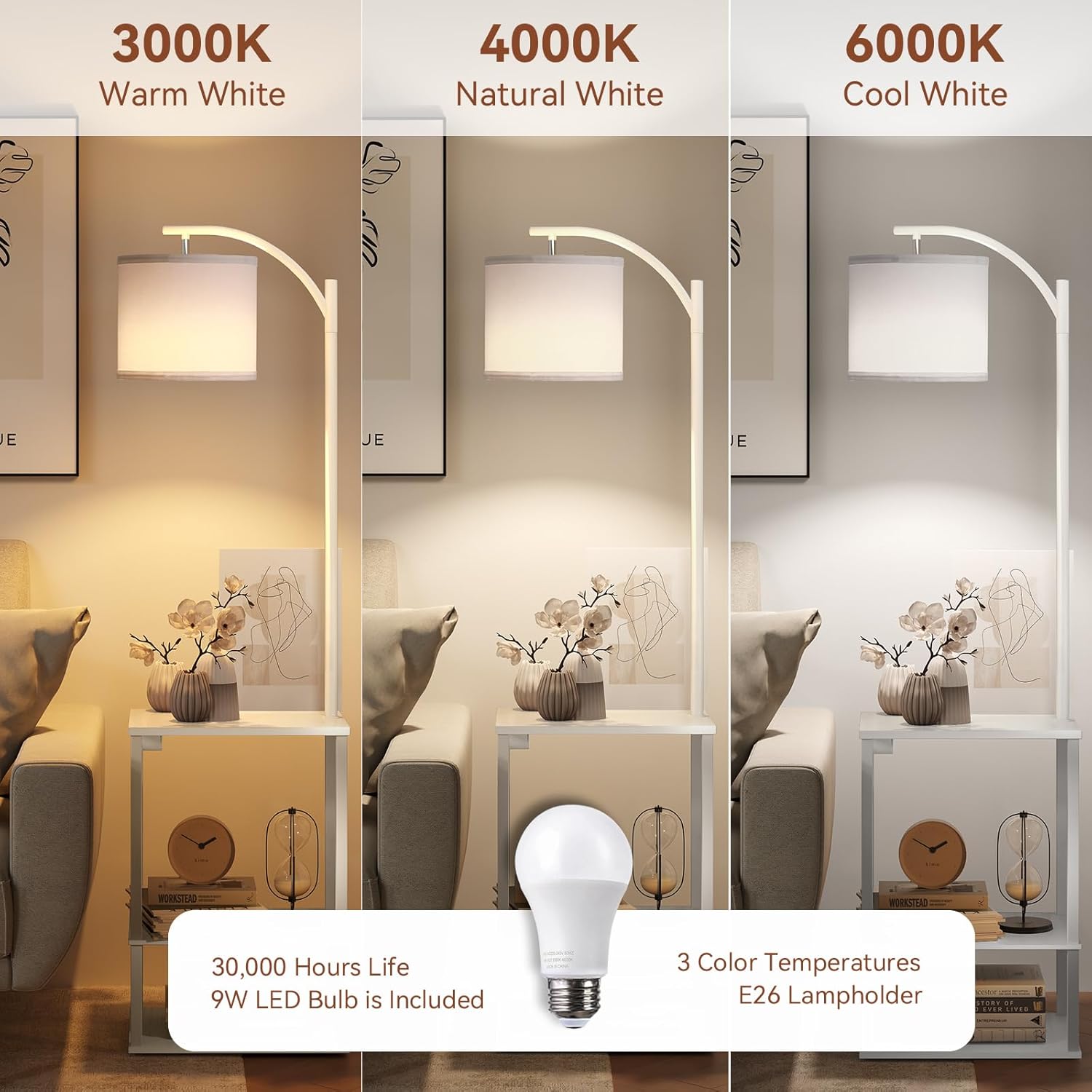 - 3 Color Temperature Floor Lamp: This floor lamp with shelves includes a 9W, 800-lumen energy-efficient E26 LED bulb. This LED floor lamps bulb is 3 color temp: 3000K/4000K/6000K. Equipped with a non-dazzling linen lampshade, it emits gentle light that’s easy on the eyes and reduces eye strain, which is perfect for both lighting and helping decorate your space. Easily switch color temperatures manually to create the perfect ambiance for different scenes.