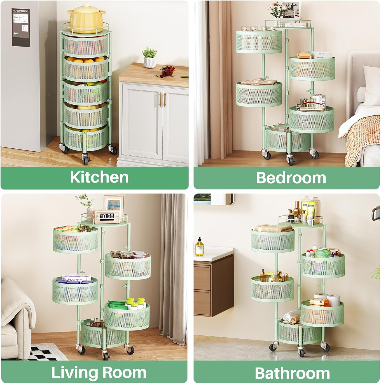 - 【Rotation Storage Rack】5 Tier rotating fruit basket design with 360° swivel wheels and 270° rotating basket allow you to take vegetable or fruits out easily. The high fence of 5.1" protects the goods well while not falling down. Additionally, the hollow design of the wire basket raise the air circulation to keeps your fruit vegetable fresh