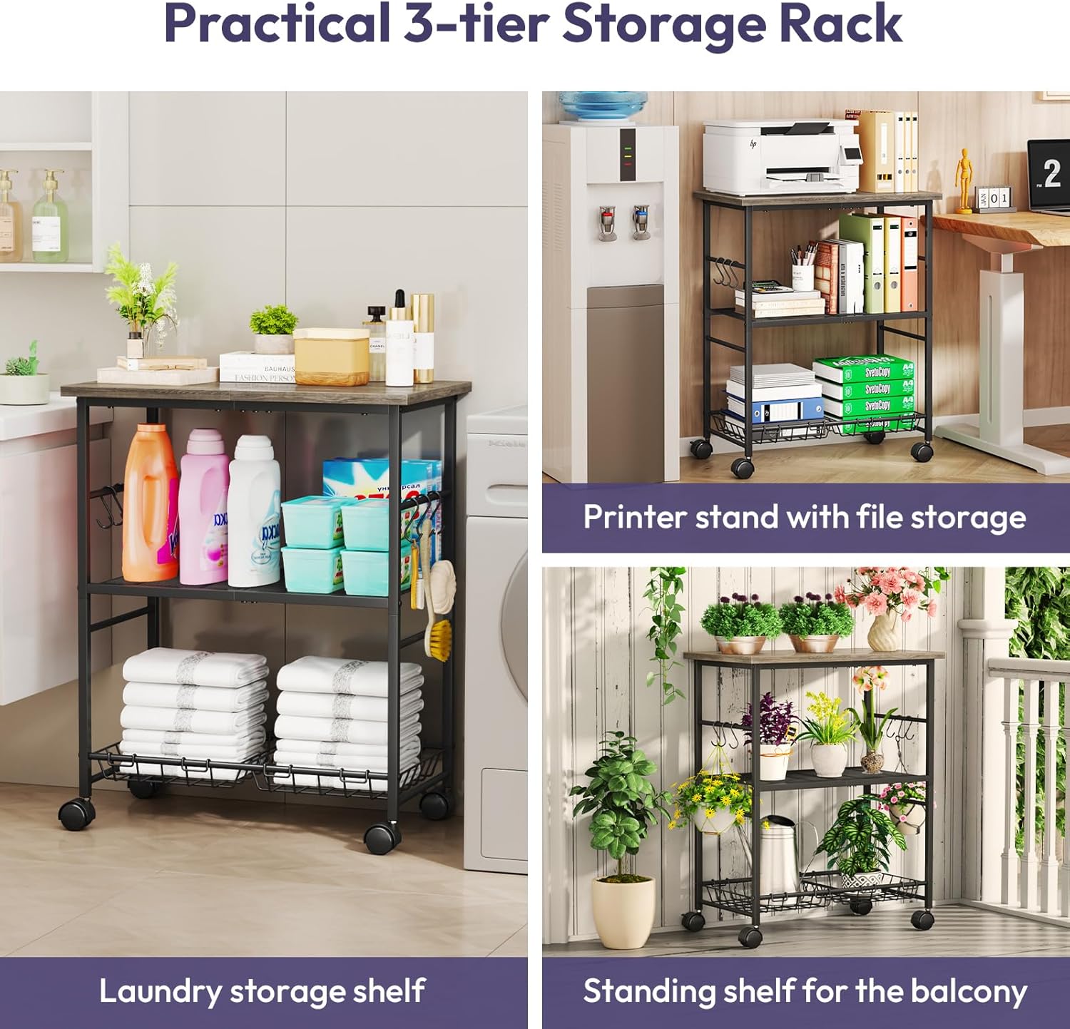 SWTYMIKI Rolling Kitchen Microwave Cart - 3 Tier Microwave Table Stand with Storage Basket and Hooks, Kitchen Utility Cart on Wheels, Coffee Cart Shelf Rack Organizer for Living Room Office, Balcony