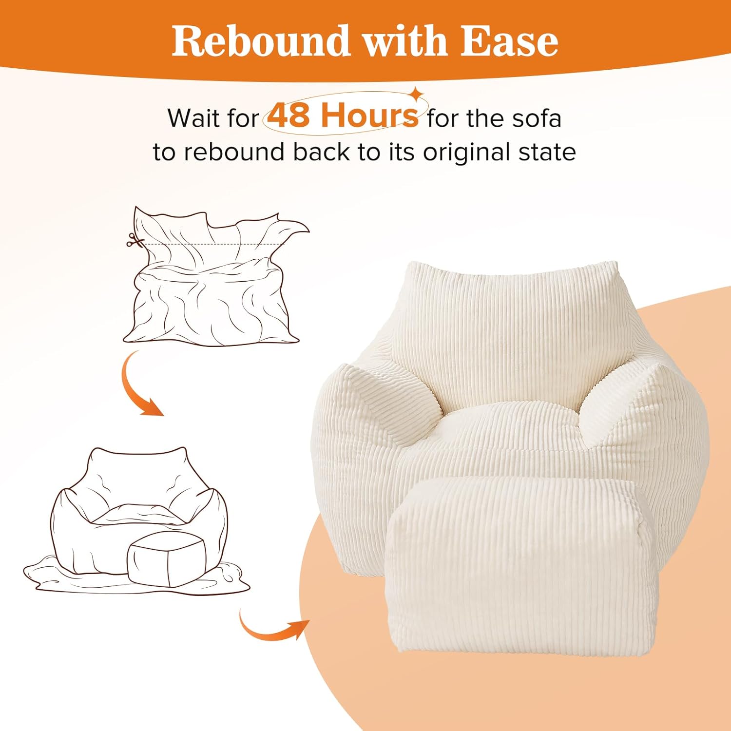 - Fully Fluffs up in 48 hours: After opening the vacuum-sealed package, simply let the floor sofa expand naturally—it typically takes 48 hours to reach full fluffiness. If it starts to feel a little flat, a quick shake or flip will redistribute the foam beads, bouncing back to its original fullness and comfort