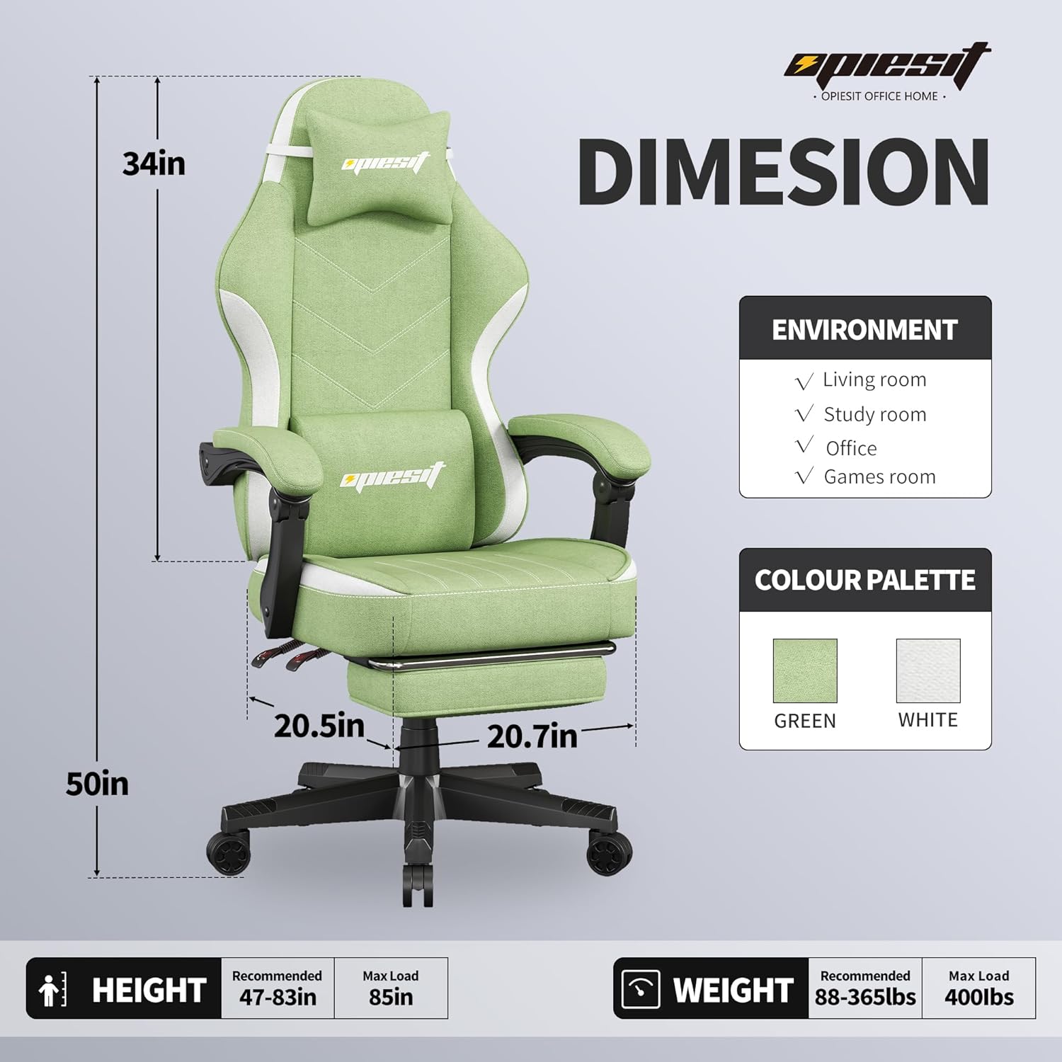 Gaming Chair,Fabric Computer Chair with Pocket Spring Cushion,400 lb Load Capacity,Ergonomic Office Chair with Footrest,Height Adjustable Video Gamer Chair with Lumbar Support (Green)