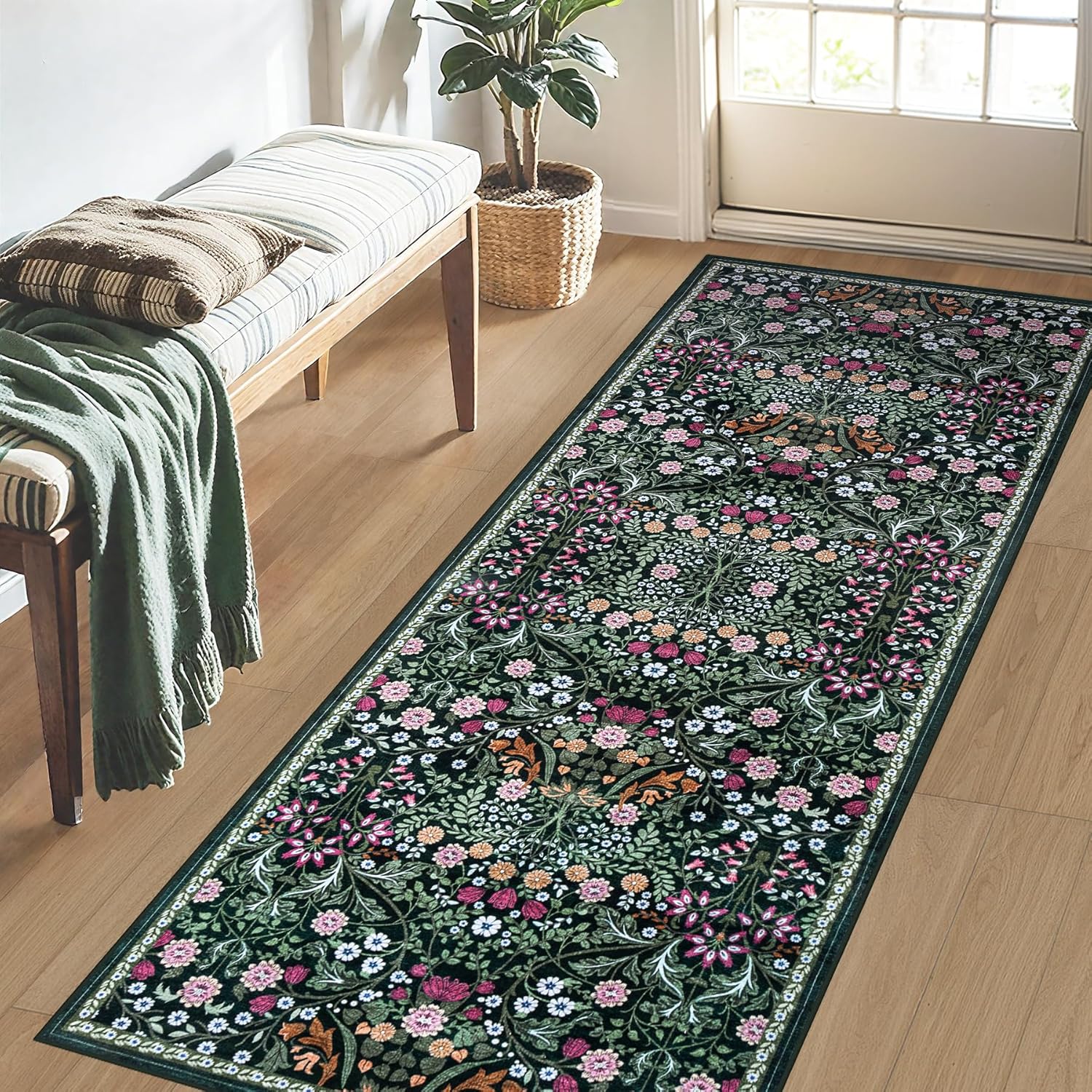 - Elegant Floral Rug: This runner rug vintage-inspired botanical rug blends rich dark greens, vibrant and delicate floral complements any decor style, from vintage and bohemian to farmhouse and modern. Perfect rugs for Entryway, Bedroom, Kitchen, Laundry, Bathroom, kids' playrooms, Hallway or home offices, it adds warmth and charm to any space. Both durable and stylish, it withstands high-traffic areas while maintaining a cozy, inviting appeal