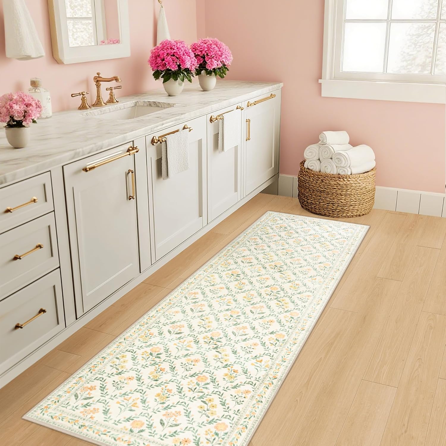 - Elegant Floral Rug: This exquisite runner rug showcases a sophisticated floral design that artfully blends blooming flowers and lush foliage. Featuring subtle blossoms in rich hues against a beige backdrop, the rug brings a refreshing natural elegance to any space. Perfect rugs for Entryway, Bedroom, Kitchen, Laundry, Bathroom, kids' playrooms, Hallway or home offices