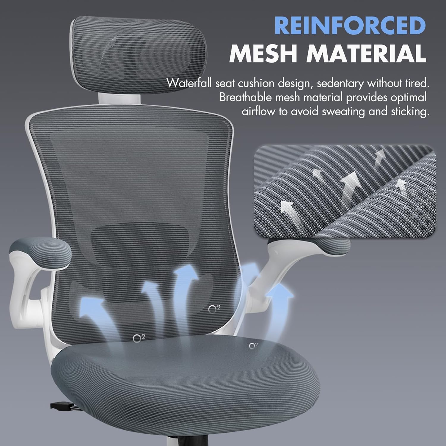 High Back Office Chair with Adjustable Lumbar Support & Headrest, Ergonomic Mesh Desk Chair with Flip-Up Armrests, Breathable & Comfortable Computer Chair for Home, Office & Study, Grey