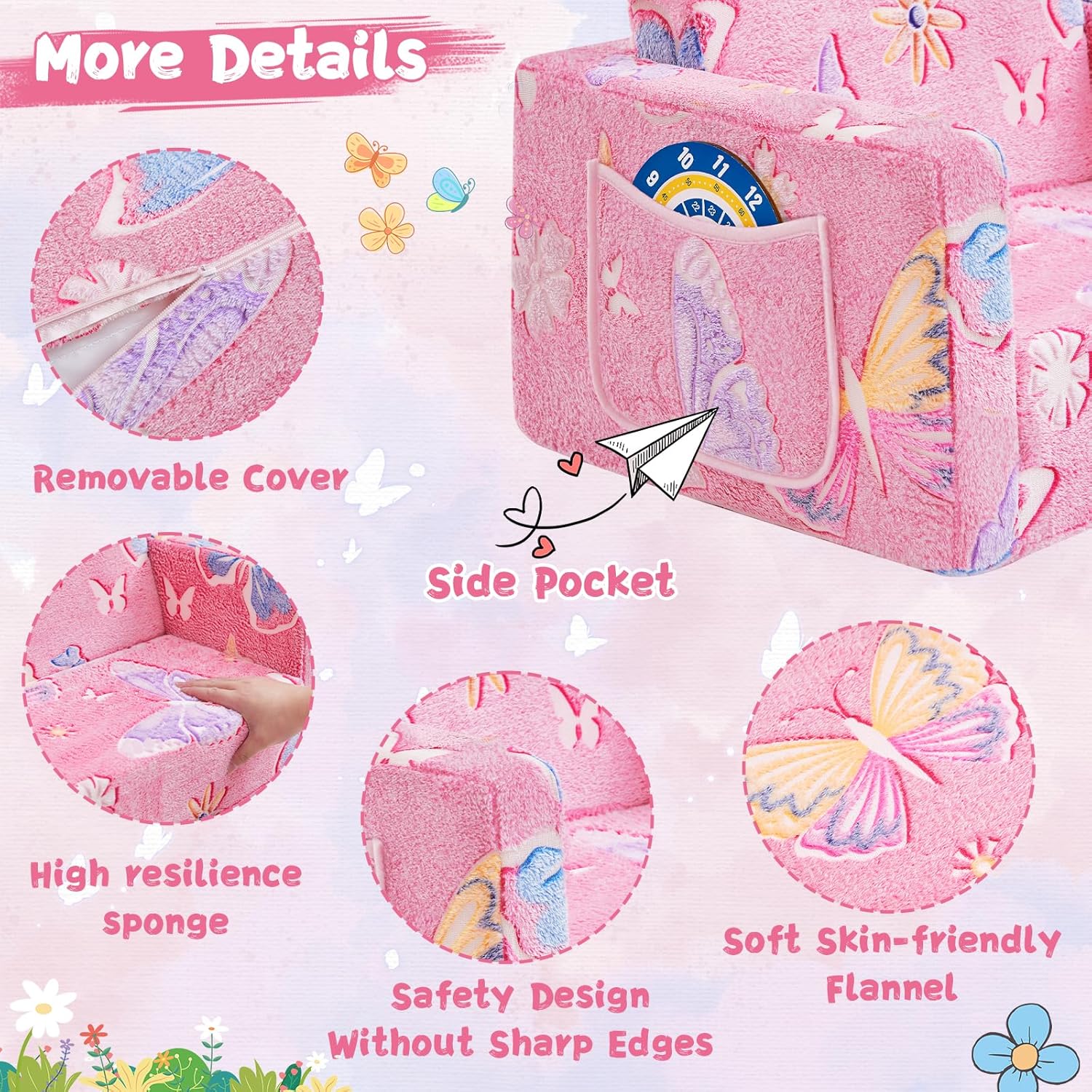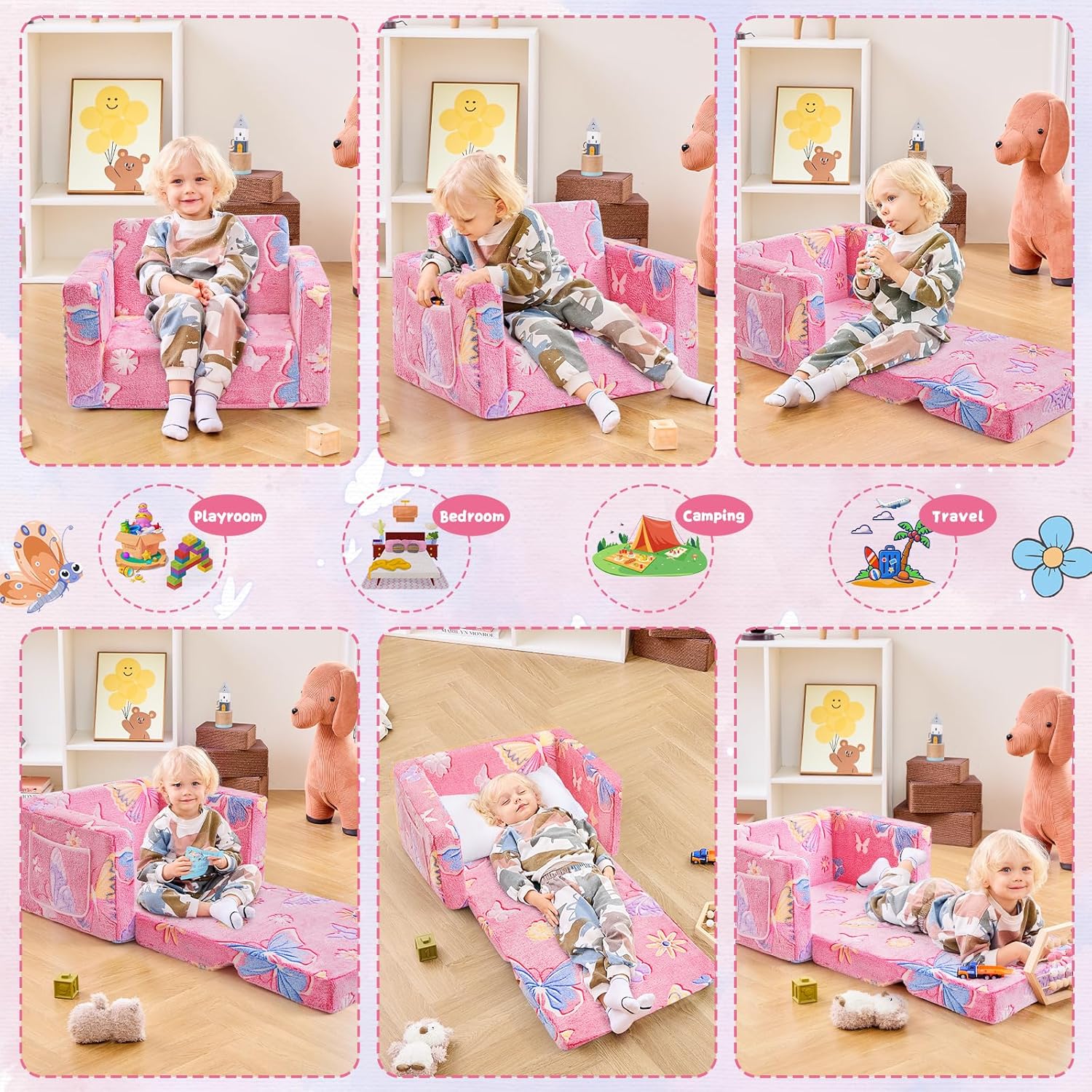 Toddler Chair Comfy,2-in-1 Soft Toddler Couch Fold Out for Kids,Convertible Sofa to Lounger,Gift for Girls and Boys Birthday,Butterfly
