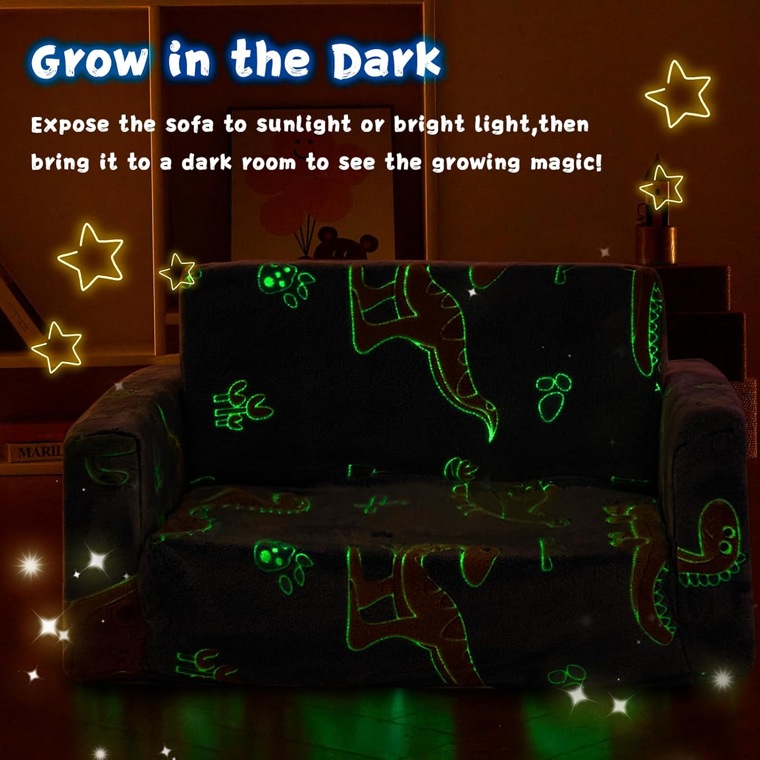 - Kids love dinosaurs—and this toddler furniture delivers just that! The lively dinosaur patterns in vibrant blue instantly catch little eyes, making playtime even more fun. At night, the glow-in-the-dark dinosaurs light up like tiny companions, keeping your child comforted and happy as they drift off to sleep. We know how important it is for kids to have a safe, cozy space to play and rest—this sofa is made just for that