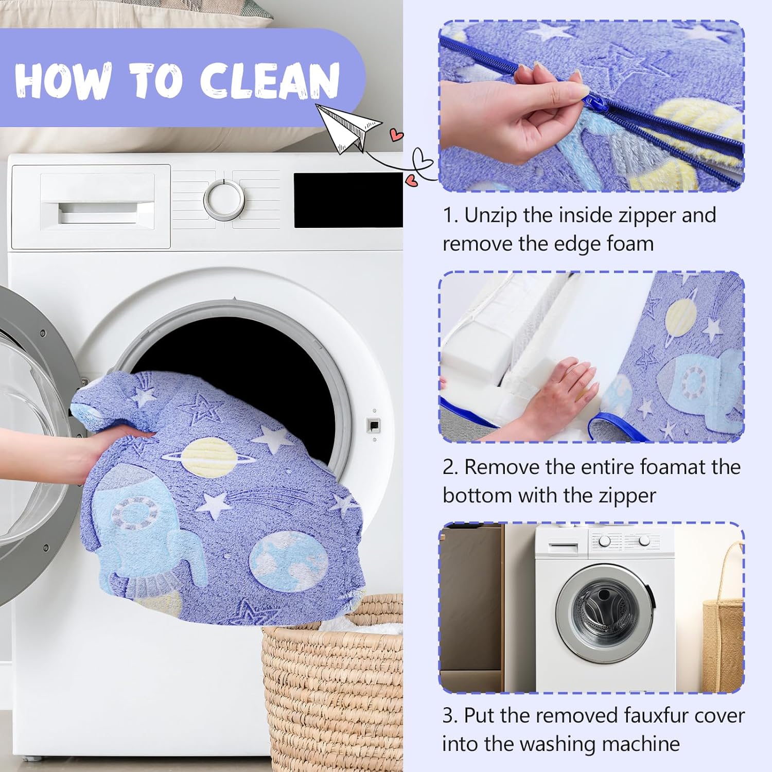 - Little astronauts will love this! This kids bean bag chair features rockets, planets, and twinkling stars in bright, fun colors that spark curiosity and imagination. At night, the glow-in-the-dark effect softly shines, bringing the stars and rockets to life and keeping your child comforted as they sleep