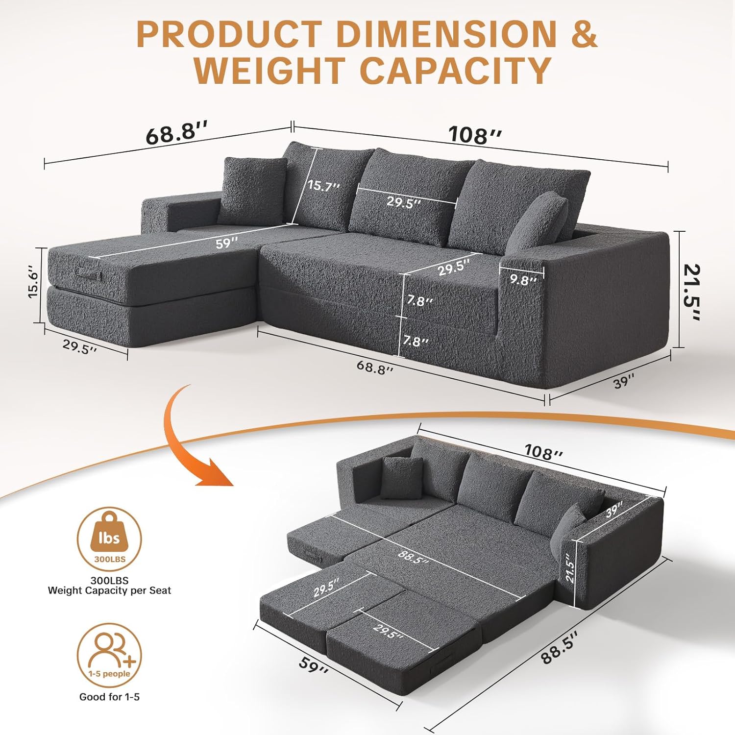 108" Modular Sectional Cloud Sofa - Boneless Couch with Deep Seat, Non Slip Base, Folding Sofa Sectional Couches for Living Room, Cozy Modular Couch with L-Shape Chaise, No Assembly Required, Grey