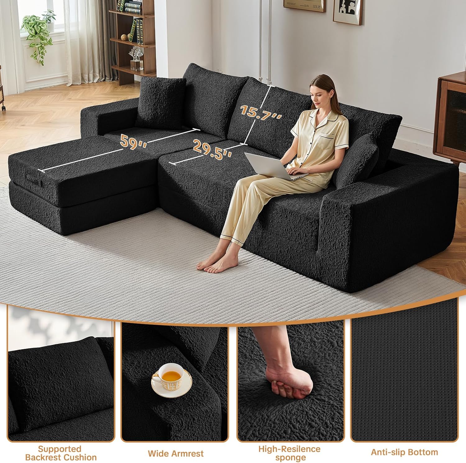 - Cloud Comfort Chaise: Sink into ultra-plush, cloud-like comfort. Meticulously crafted with high-resilience foam that adapts to your body’s curves for personalized support. The generous 29.5-inch deep seat delivers a cradling embrace, offering lasting comfort perfect for lounging, reading, or entertaining. Experience luxurious immersion surpassing traditional sofas—blending exceptional resilience with enduring durability.