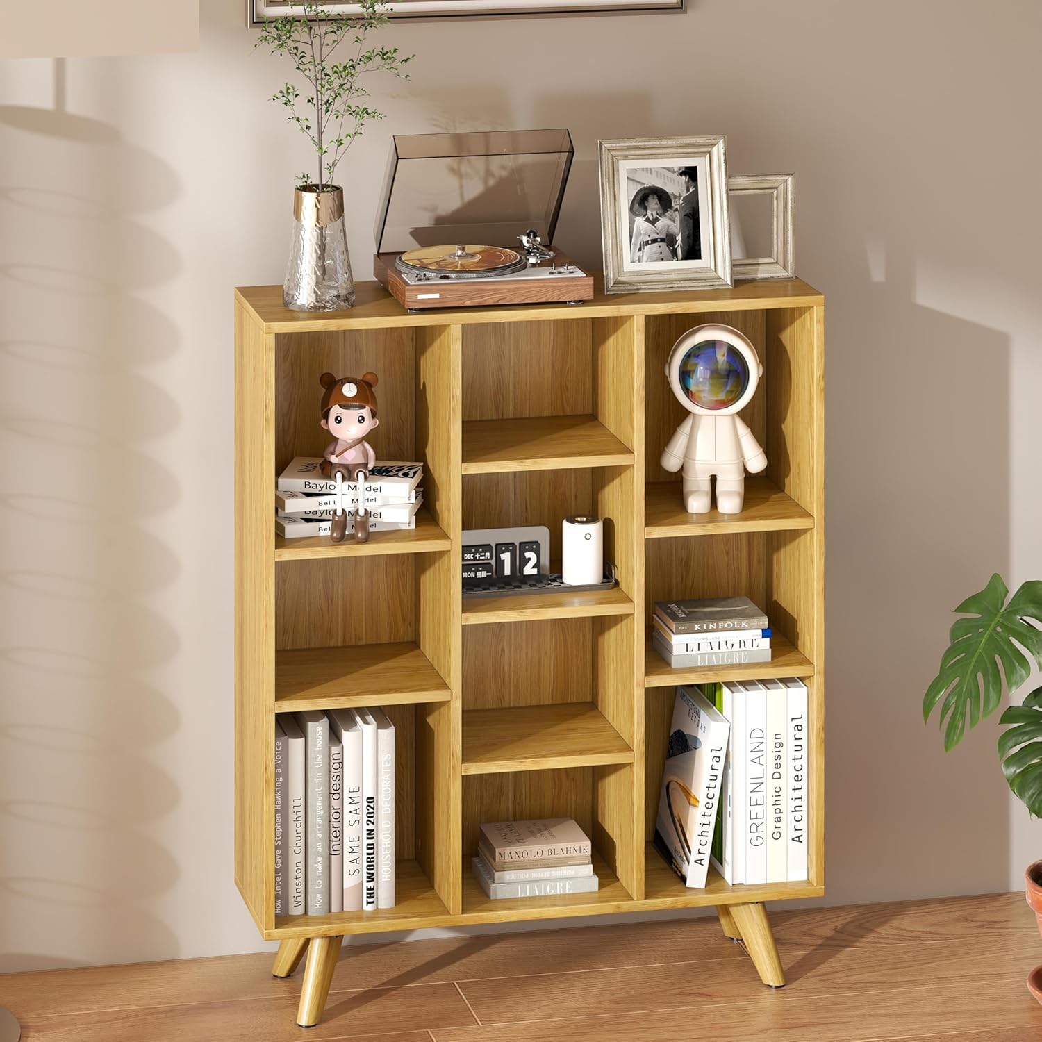 Manora Bookshelf with 10 Open Storage Cubes, Wooden Bookcase Organizer, Rustic Modern Display Shelf for Living Room, Bedroom, Office