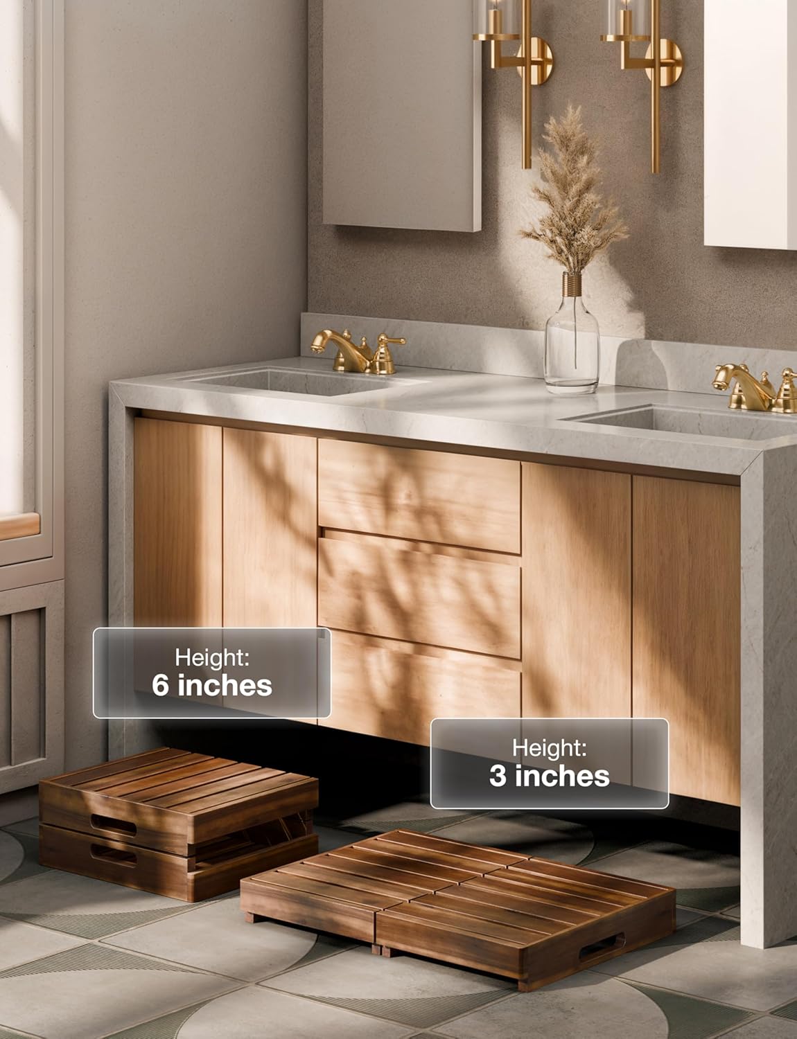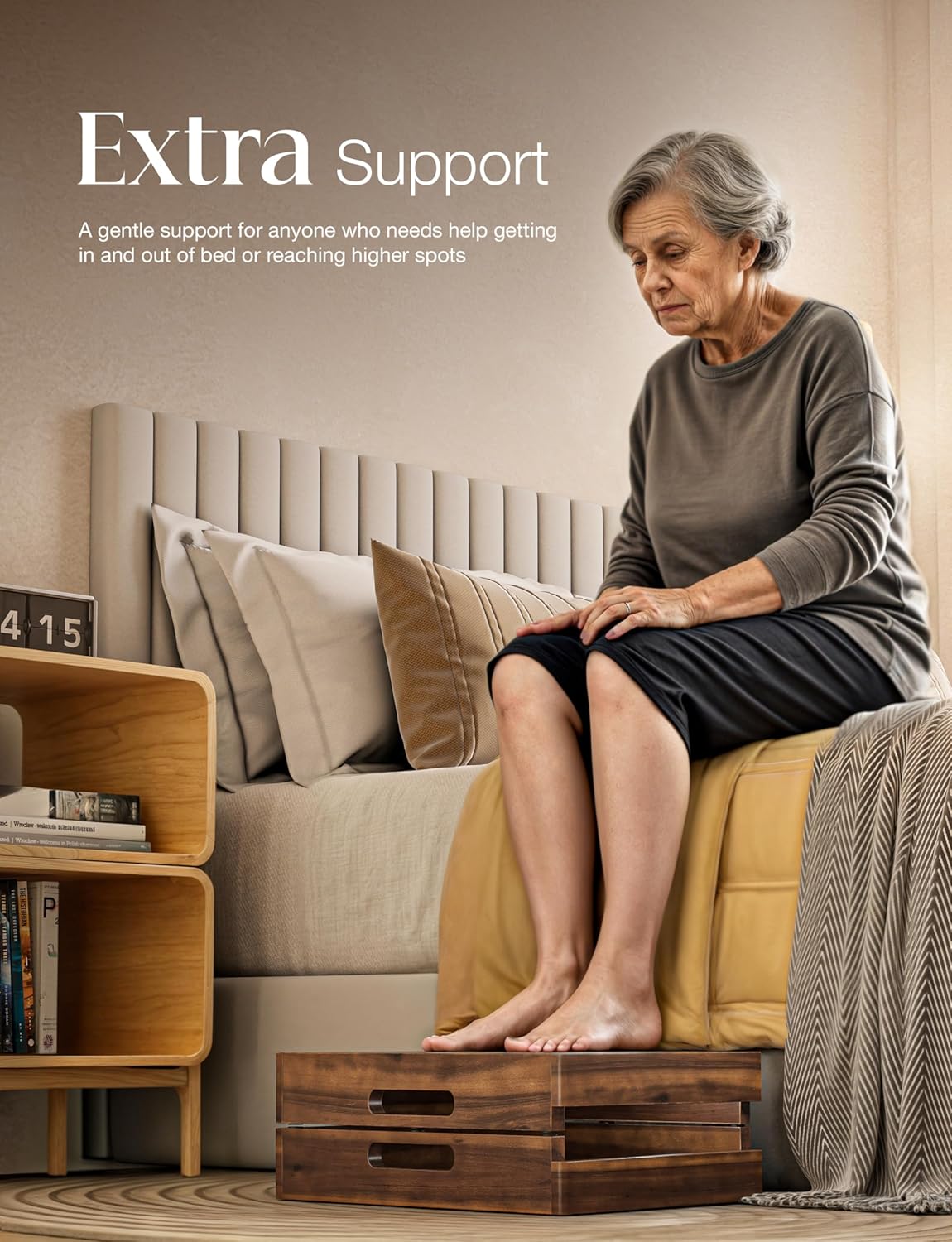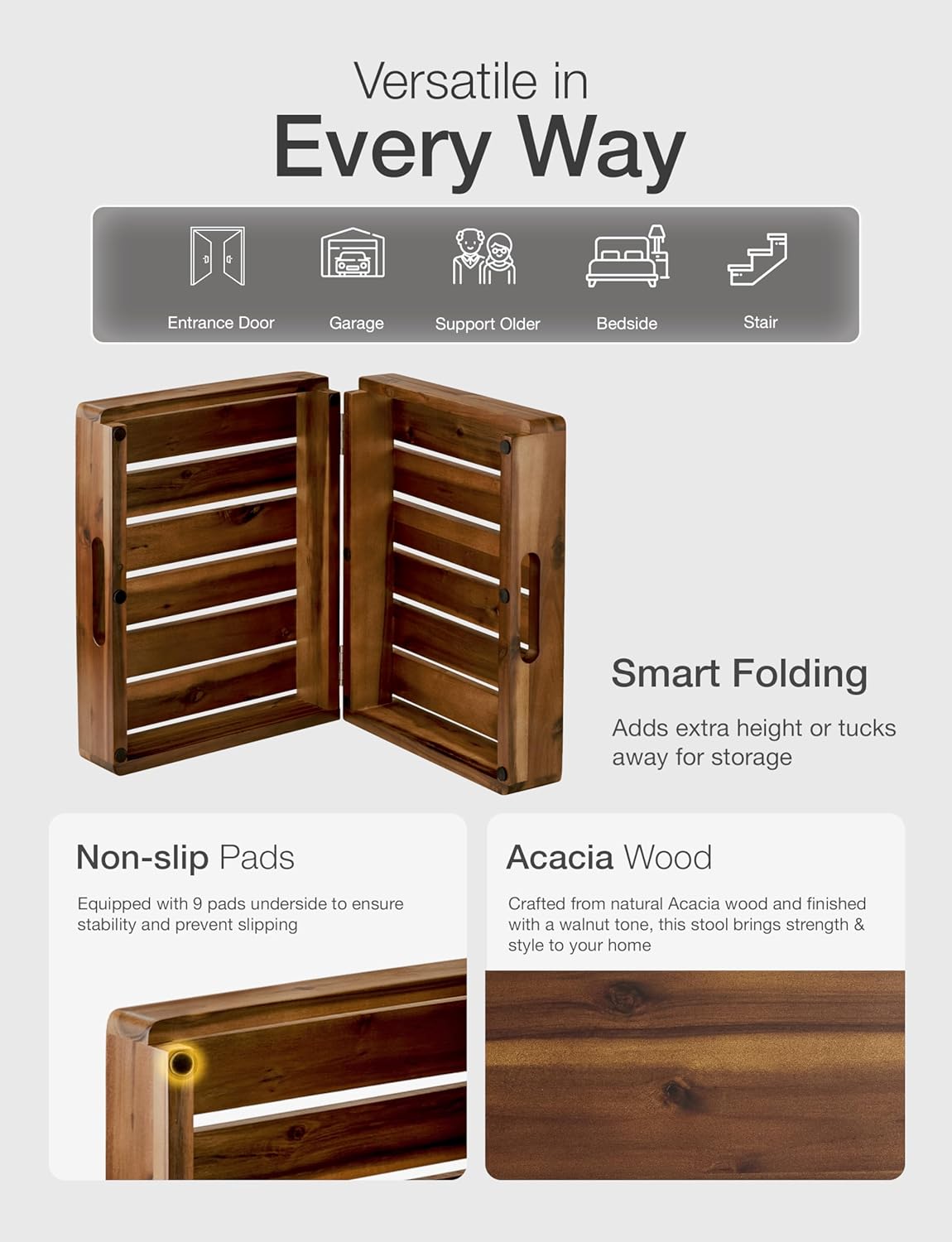- Natural Acacia Wood: Crafted from premium acacia, this sturdy wooden step supports up to 400 lbs, combining durability with a warm walnut finish. A reliable wood step stool for adults that blends strength and style