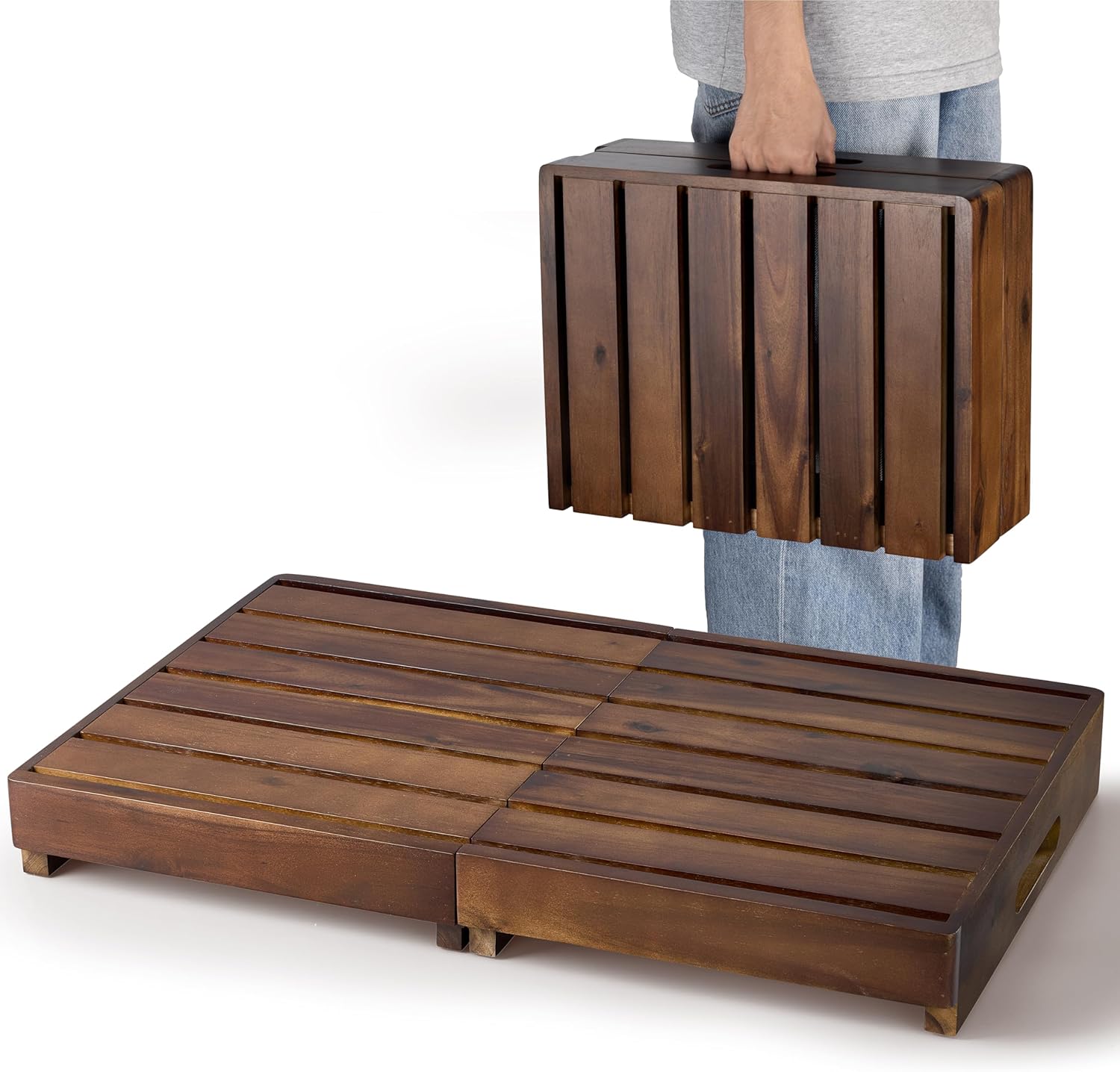 - Slatted Surface Design: The slatted top prevents water buildup, improves ventilation, and adds a rustic touch. Making this wooden platform ideal for both indoor and outdoor use