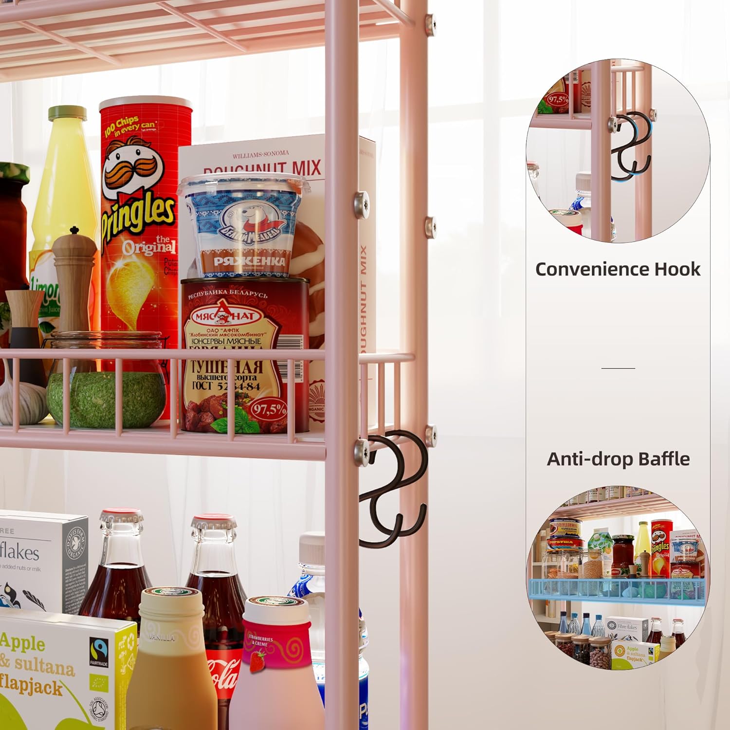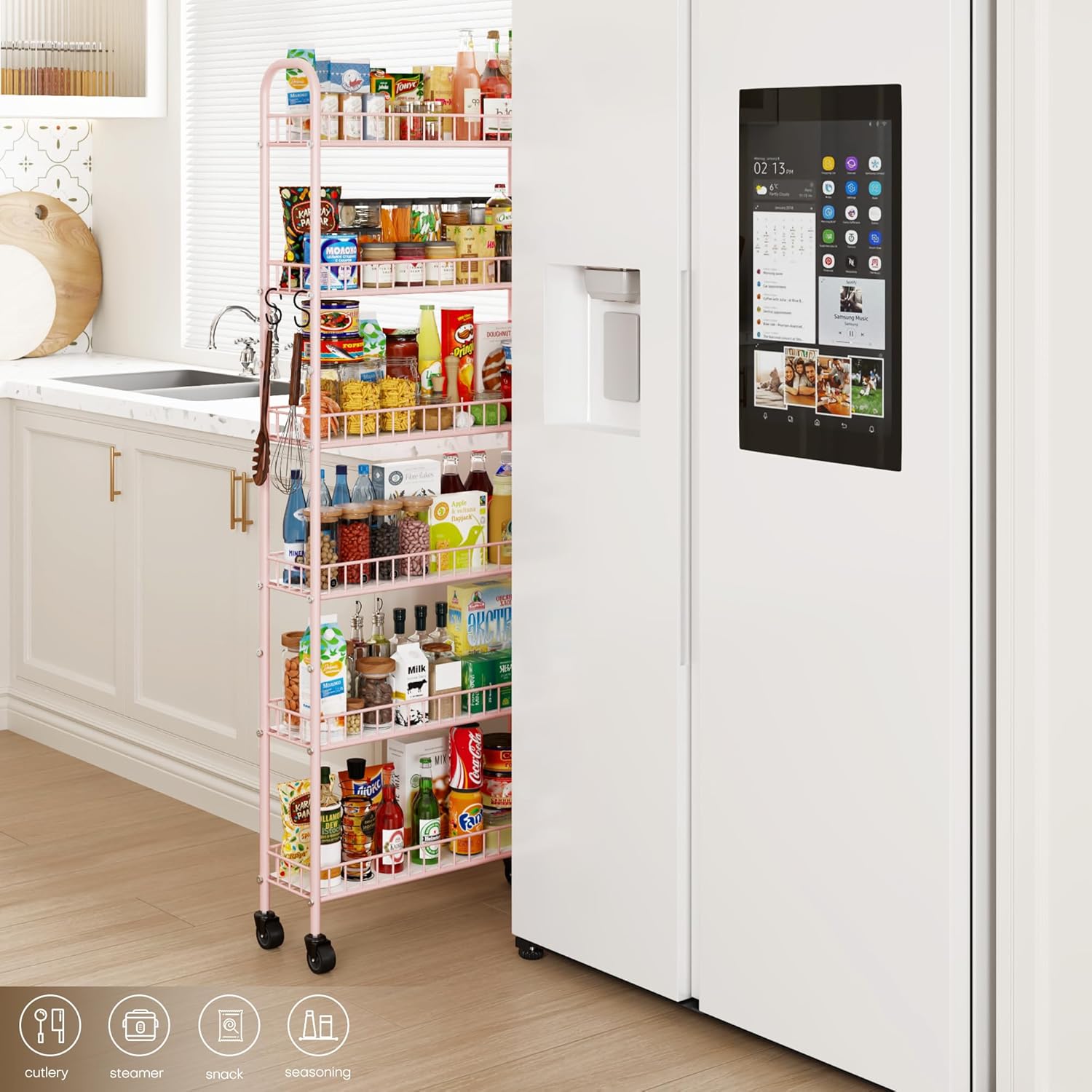 6-Tier Slim Storage Cart, Rolling Kitchen Cart with Wheels, Narrow Metal Shelf Organizer with Hooks for Kitchen, Bathroom, Living Room, Laundry, Small Spaces (Pink, 6 in)