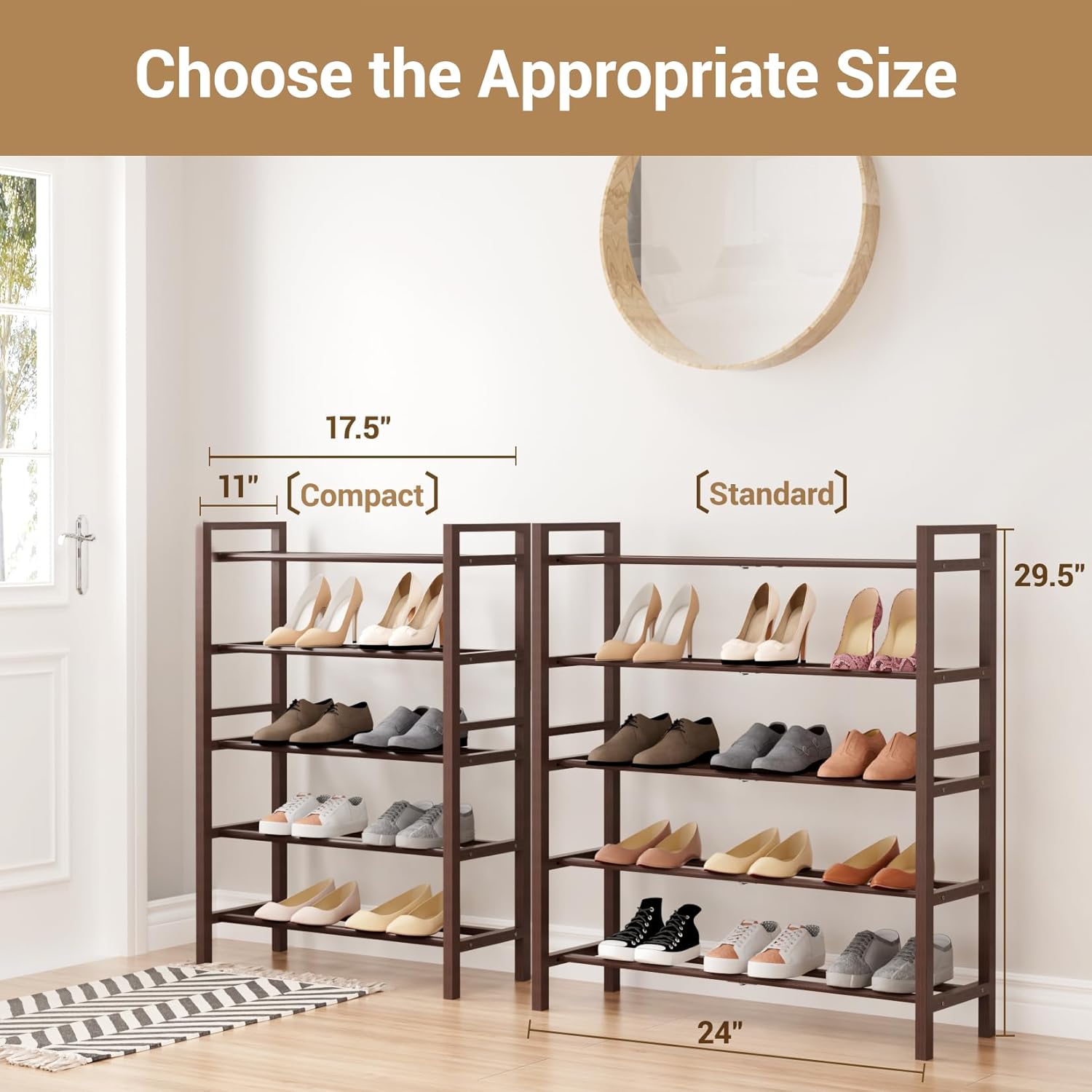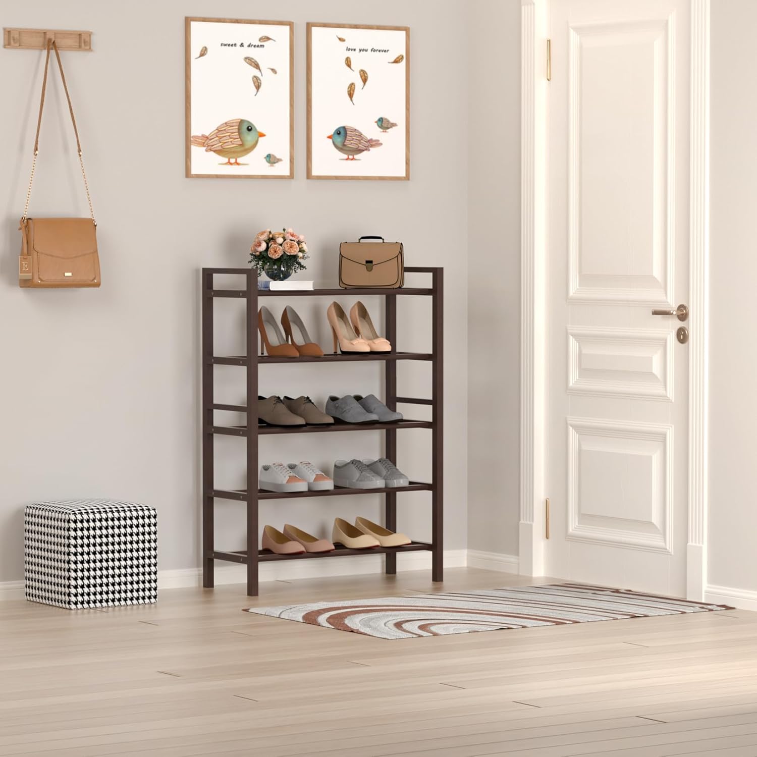 Haddockway Bamboo Shoe Rack for Closet, Free Standing Shoe Organizer with Smooth Round Rods & Convenient Handles, Stackable Shoe Storage Shelf for Entryway, Hallway(Brown, 5-Tier(Small))