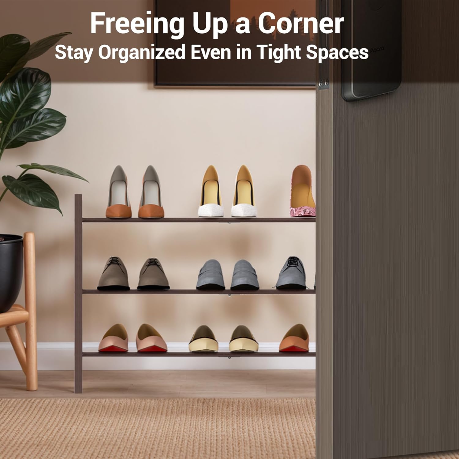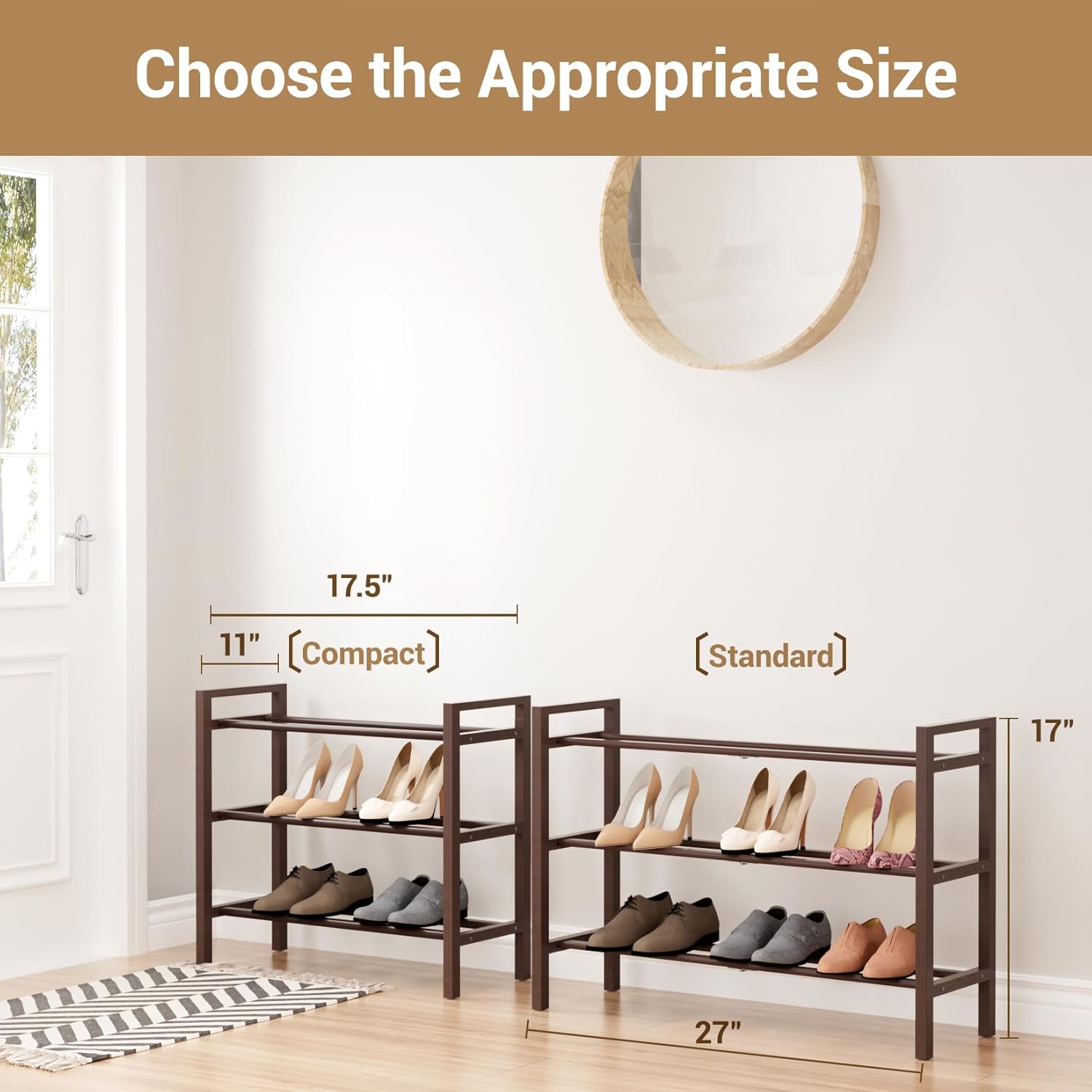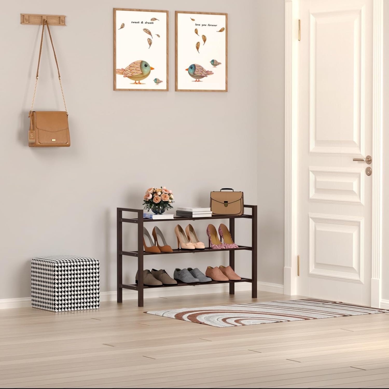 Haddockway Bamboo Shoe Rack for Closet, Free Standing Shoe Organizer with Smooth Round Rods & Convenient Handles, Stackable Shoe Storage Shelf for Entryway, Hallway(Brown, 3-Tier)