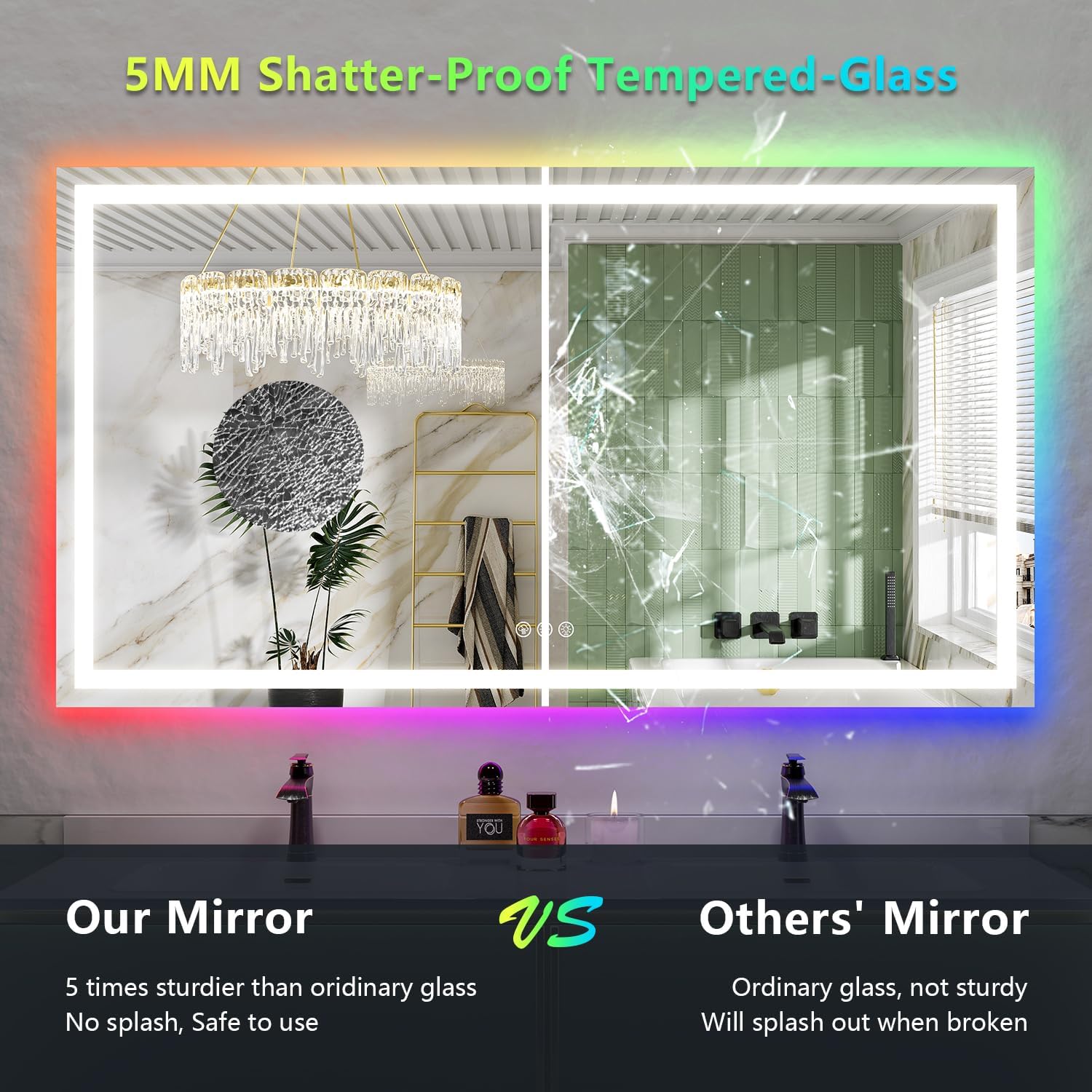 - 💎【3+8 Light Colors, Make a Difference】- This led mirror for bathroom has 3 front light modes: warm(3000K), white (4000K) and cold (6000K). RGB backlit has 8 light modes: warm / white / cold / flowing colorful / purple / red / green / blue. THE BACK LIGHT CAN BE WHITE ONLY! The muli color tone options are what makes this led vanity mirror and what makes your bathroom truly difference.