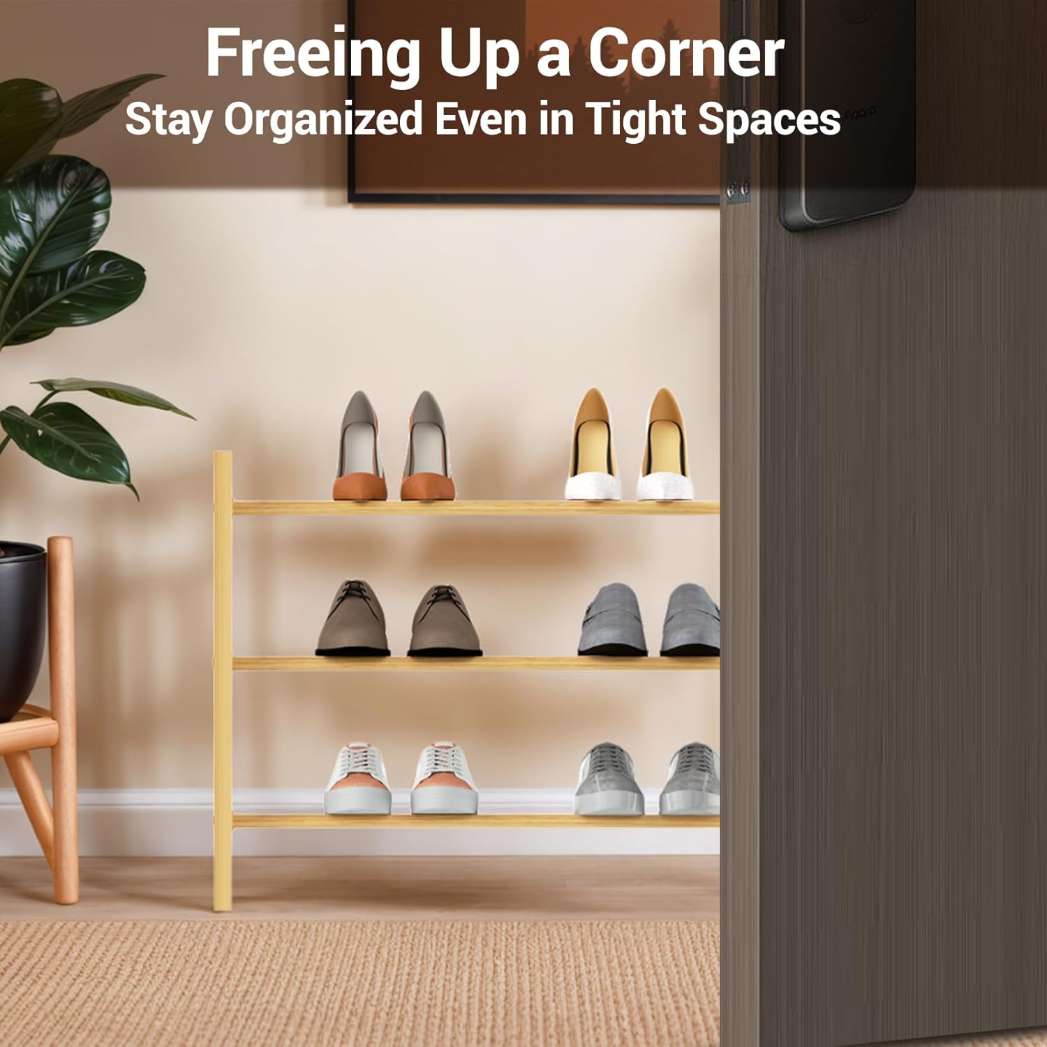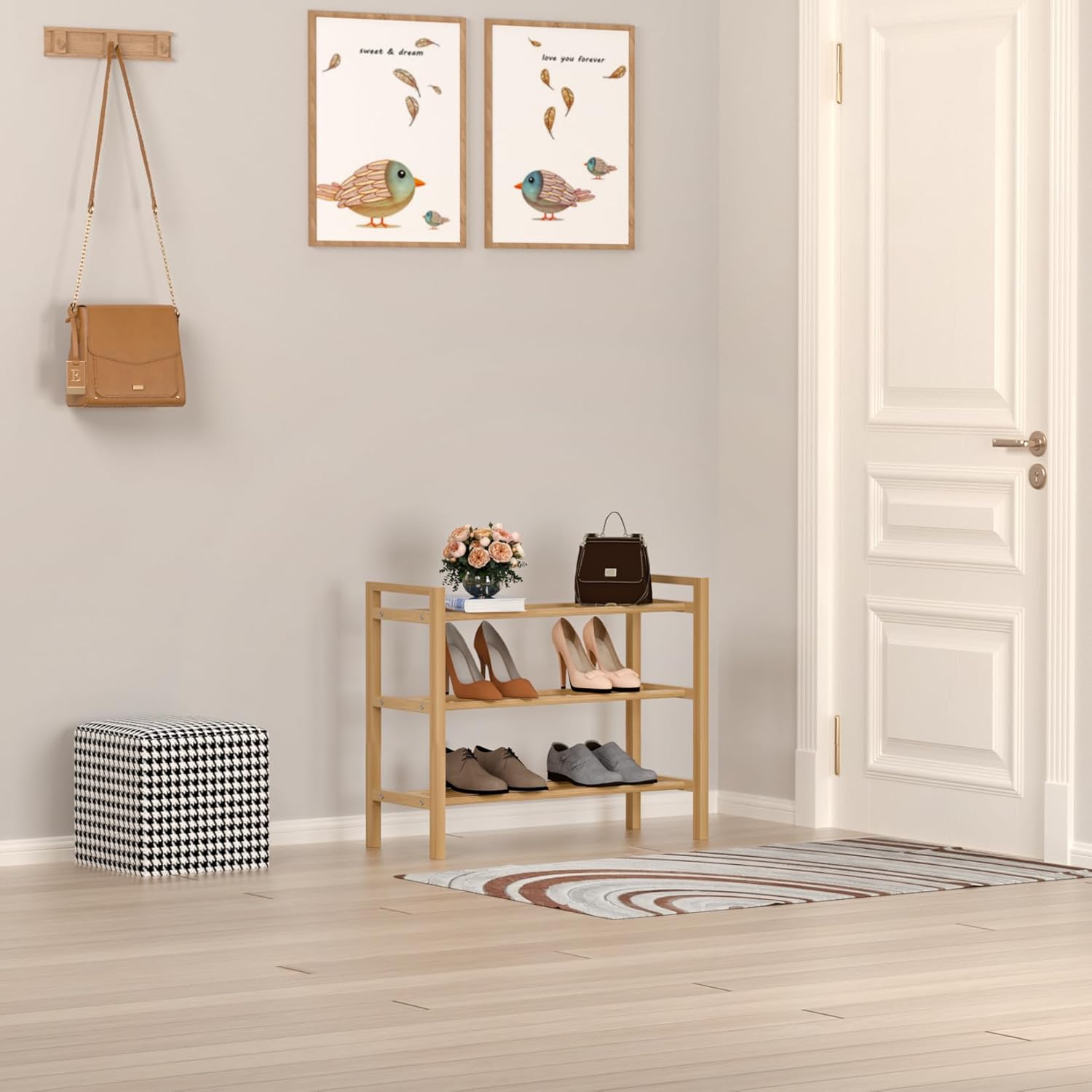 Haddockway Bamboo Shoe Rack for Closet, Free Standing Shoe Organizer with Smooth Round Rods & Convenient Handles, Stackable Shoe Storage Shelf for Entryway, Hallway(Natural, 3-Tier(Small))