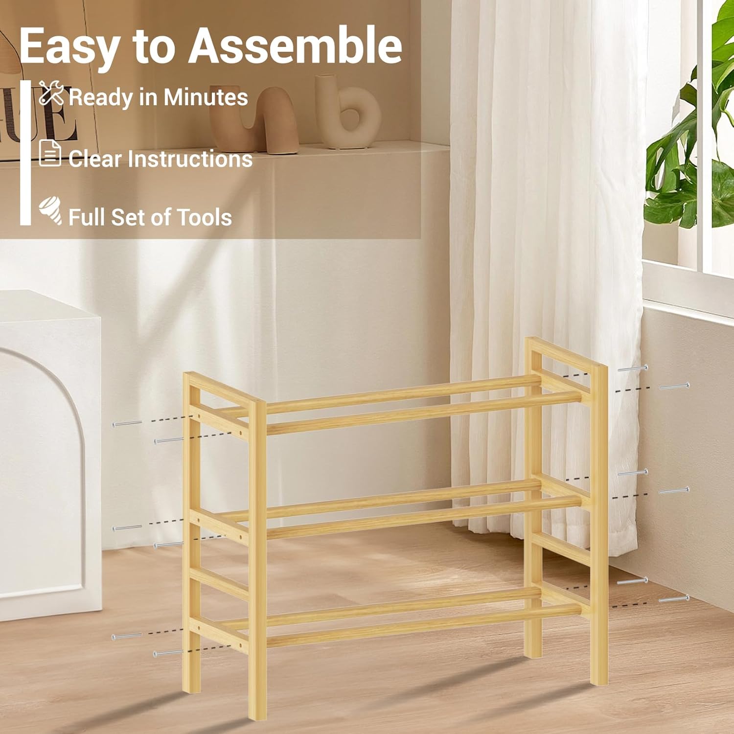 - 【Effortless Assembly】Designed for quick setup,this bamboo shoe rack for entryway can be put together in minutes with little effort. You can also easily remove one or two layers when needed to fit taller shoes. Its smooth wooden surface is easy to wipe clean, making maintenance hassle-free.