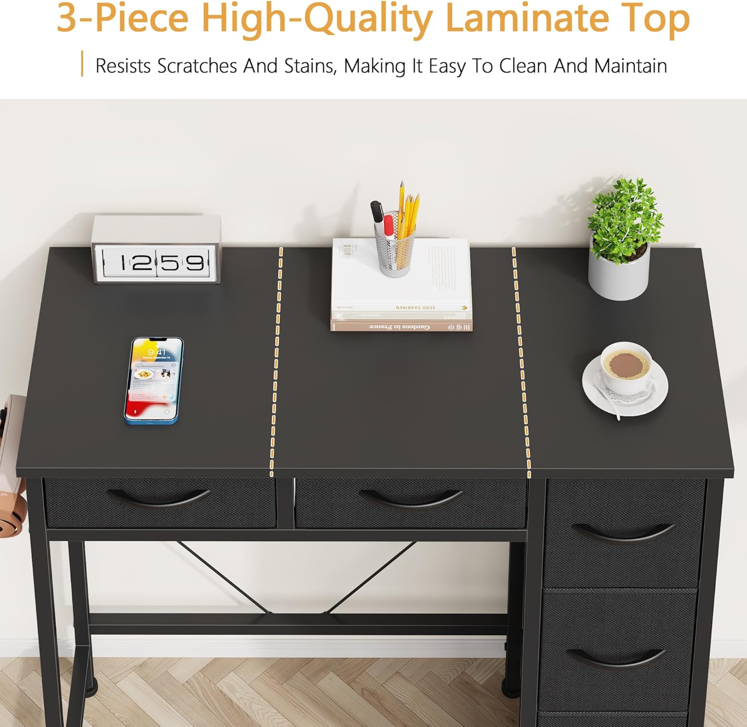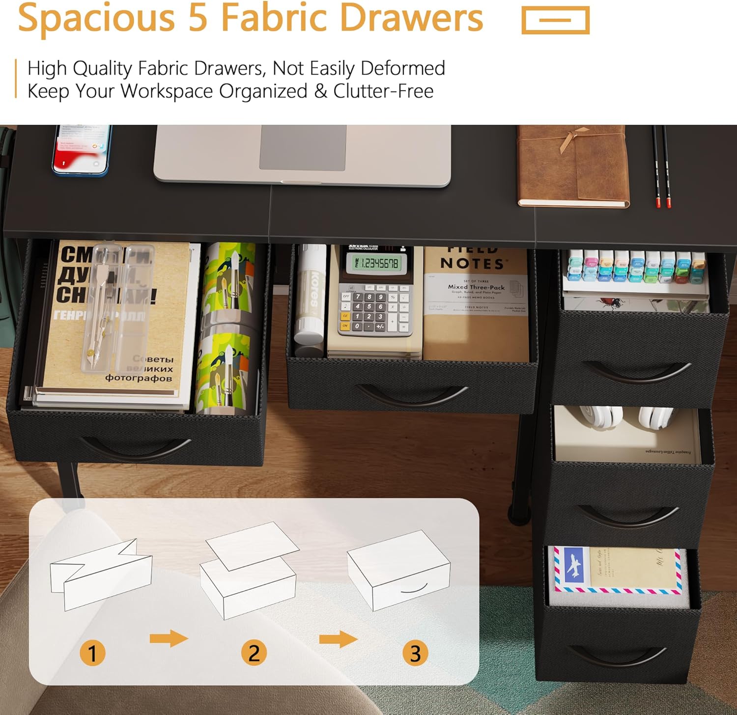 - 【Ample Desk with Storage】Equipped with 5 spacious fabric drawers and a hook, this desk with storage helps you keep your workspace tidy and organized. It offers plenty of room for school supplies, office essentials, or personal items, making it a truly practical small desk for any space