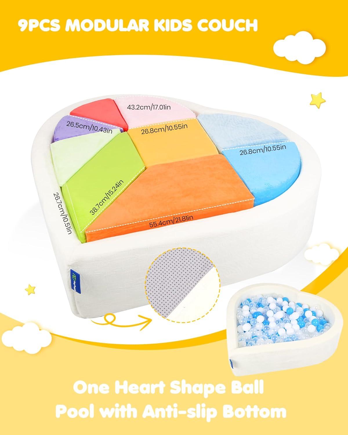 - Ideal Gift for Your Child : This modular play couch comes with 9 pieces of different shapes that can be endlessly combined, inspiring children's imagination and creativity. Also, it includes an unique heart-shape ball pit with inner mat and anti slip bottom to enhance safety and fun, which is your ideal gift choice. The flexibility of the design allows for adaptability as your child grows, ensuring that the play couch remains engaging and age-appropriate for years to come.
