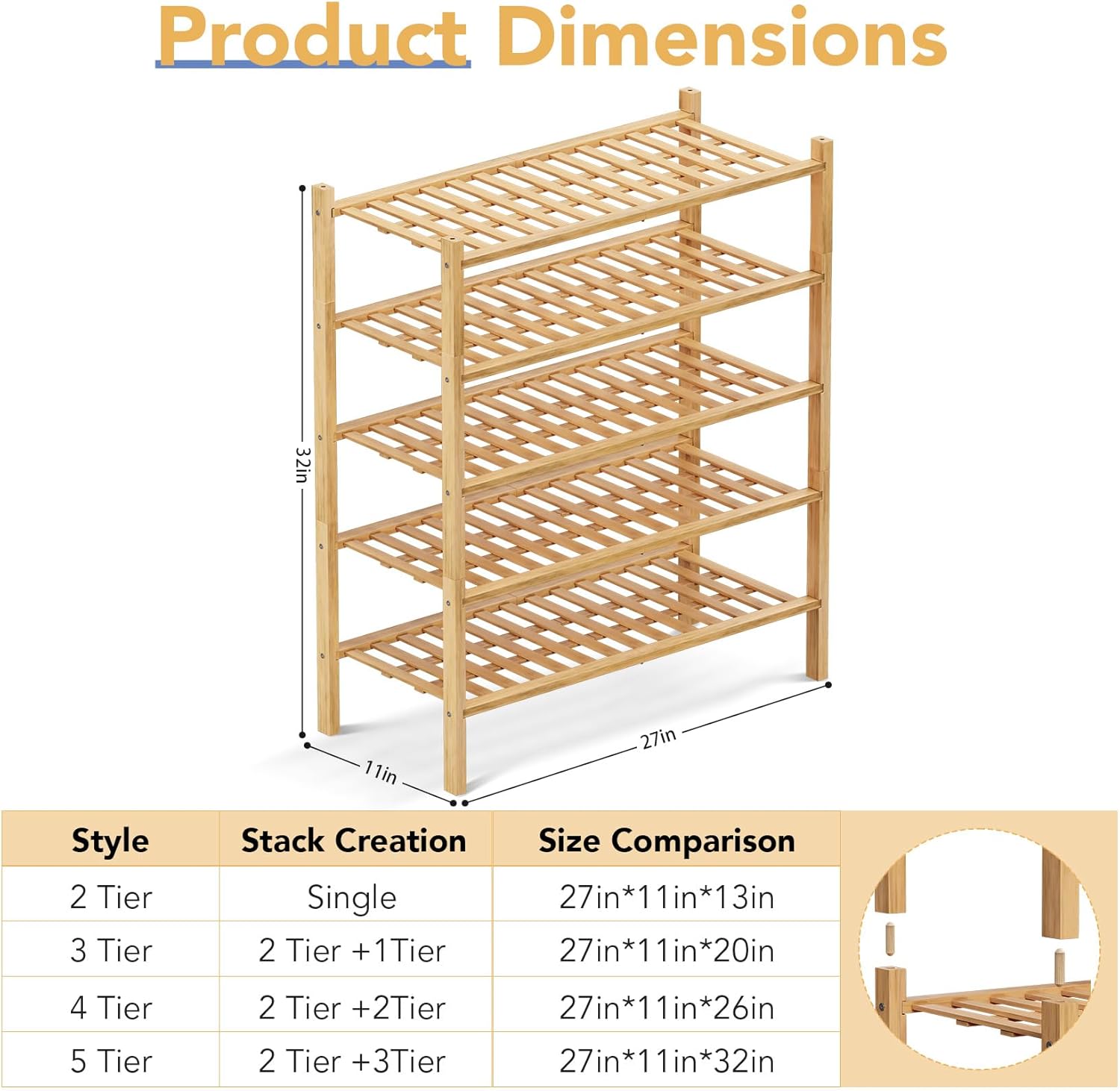 Haddockway 5 Tier Bamboo Shoe Rack Storage Organizer, Multifunctional Free Standing Stackable Shoe Shelf with Grid Panel for Closet,Hallway,Entryway,Small Space 27"x11"x32" (Natural, 5 Tier)