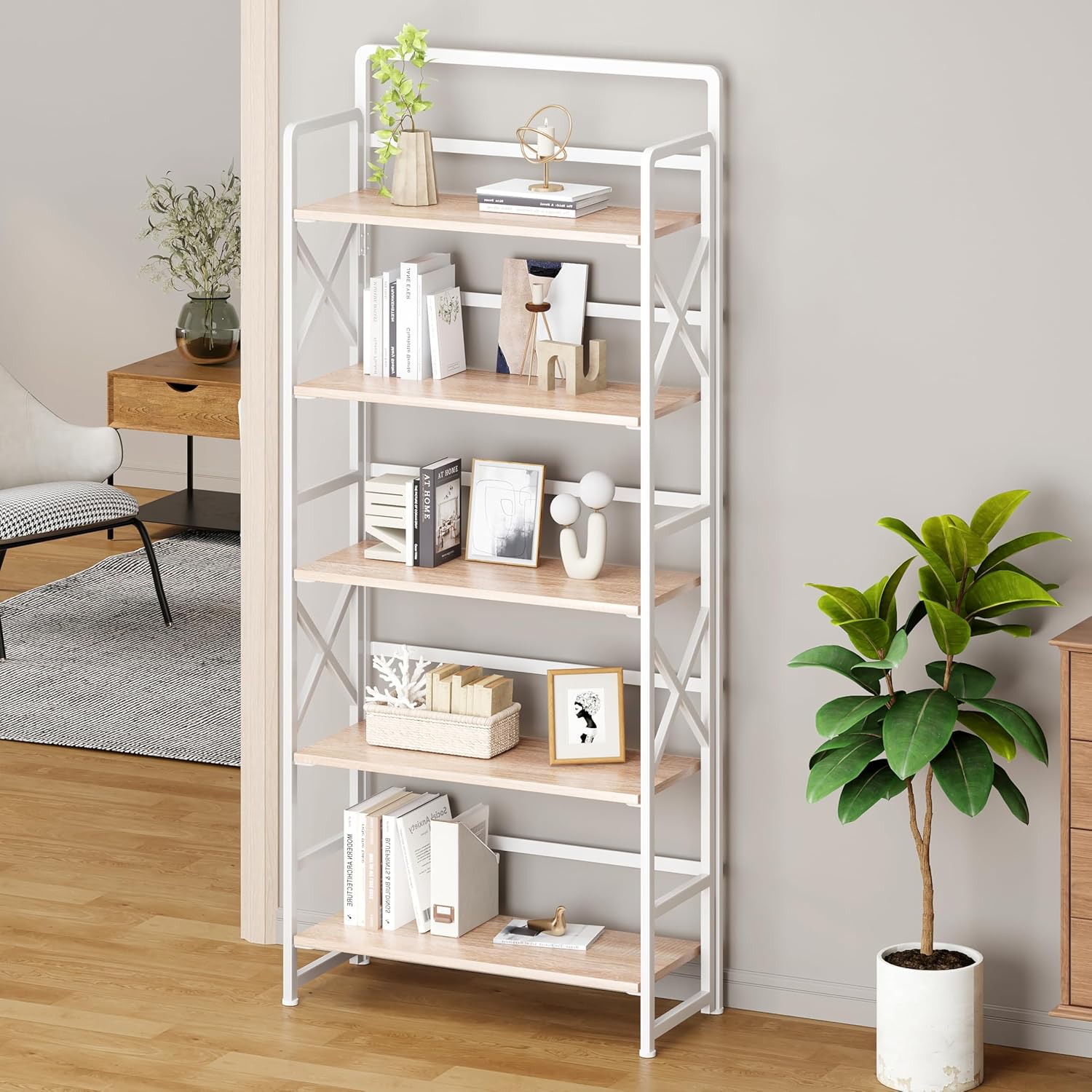 No Assembly Folding Bookshelf, 5 Tiers Vintage Wood Collapsible Book Shelf for Storage,Industrial Metal Foldable Bookcase Organizer for Living Room Bedroom Home Office (Beige)