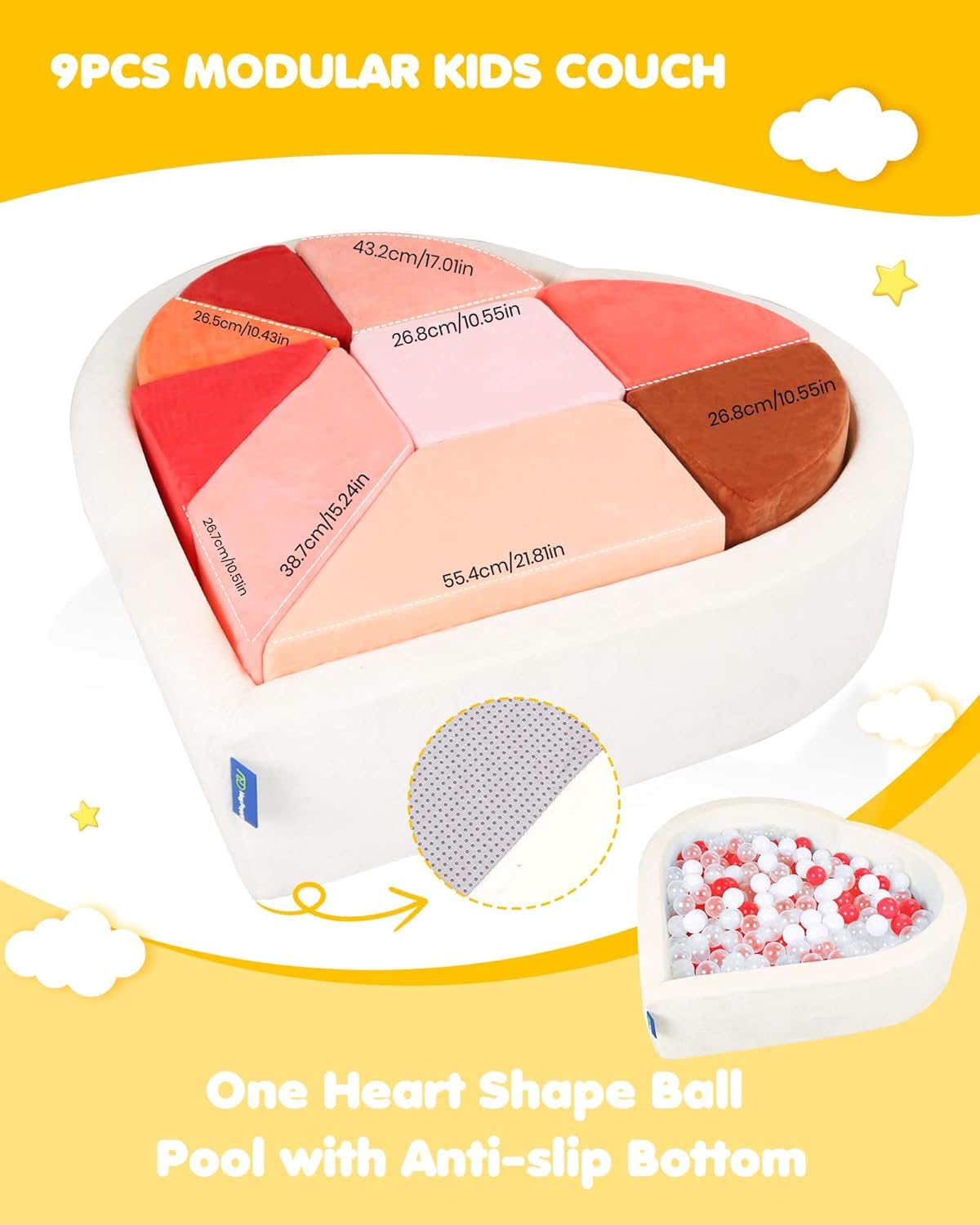- Ideal Gift for Your Child : This modular play couch comes with 9 pieces of different shapes that can be endlessly combined, inspiring children's imagination and creativity. Also, it includes an unique heart-shape ball pit with inner mat and anti slip bottom to enhance safety and fun, which is your ideal gift choice. The flexibility of the design allows for adaptability as your child grows, ensuring that the play couch remains engaging and age-appropriate for years to come.