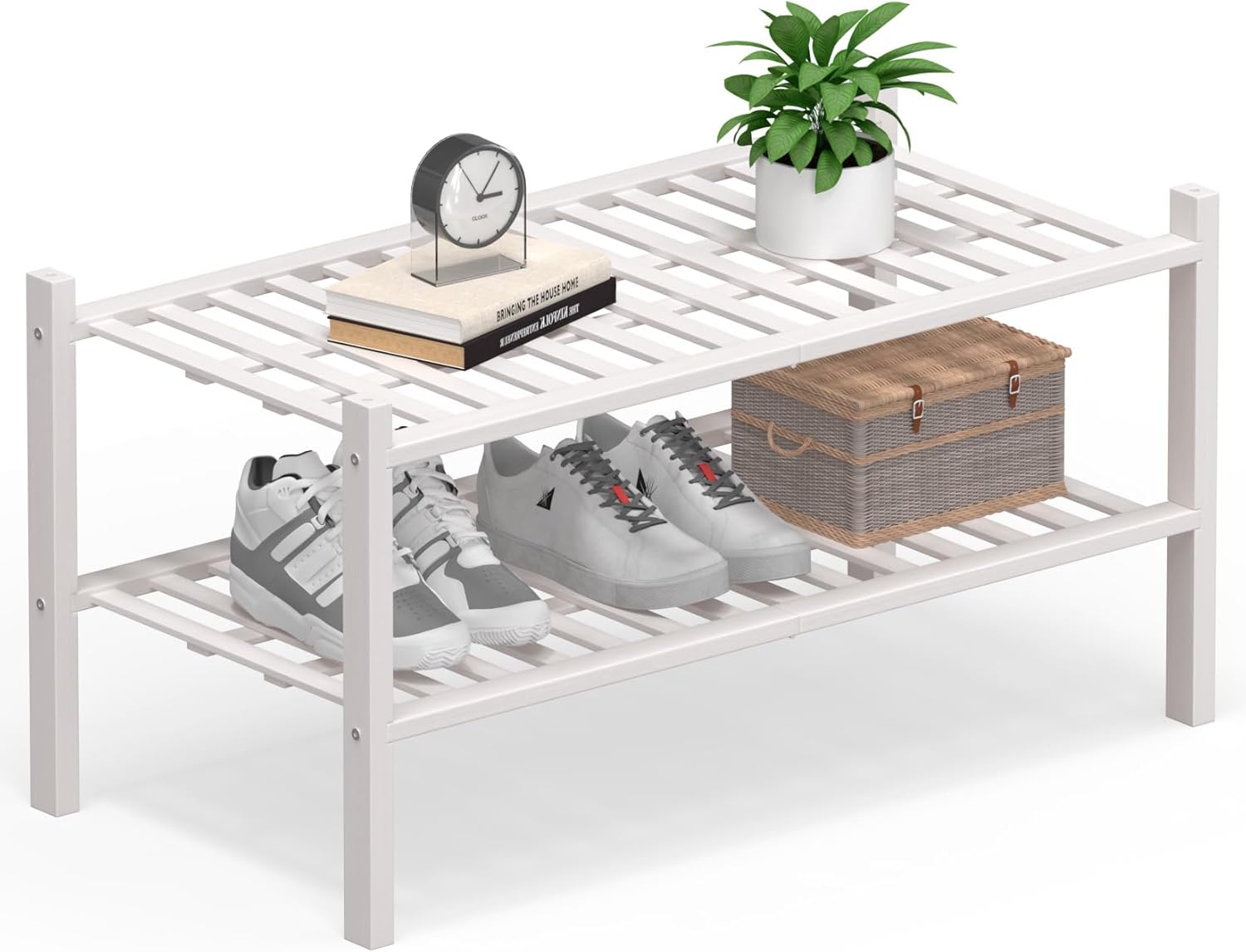Haddockway Large 2 Tier Bamboo Shoe Rack Storage Organizer, Multifunctional Free Standing Stackable Shoe Shelf with Grid Panel for Closet,Hallway,Entryway,Small Space 27"x12"x14"(White, 2-Tier(Large))