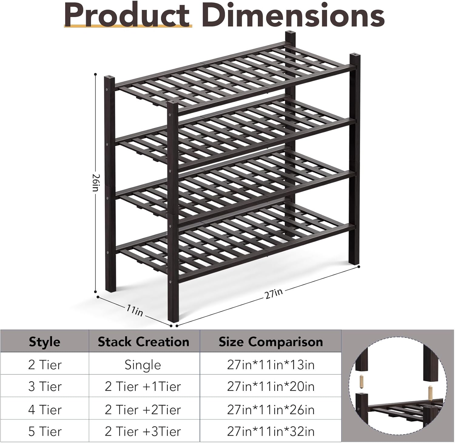 Haddockway 4 Tier Bamboo Shoe Rack Storage Organizer, Multifunctional Free Standing Stackable Shoe Shelf with Grid Panel for Closet,Hallway,Entryway,Small Space 27"x11"x26"(Brown, 4 Tier)